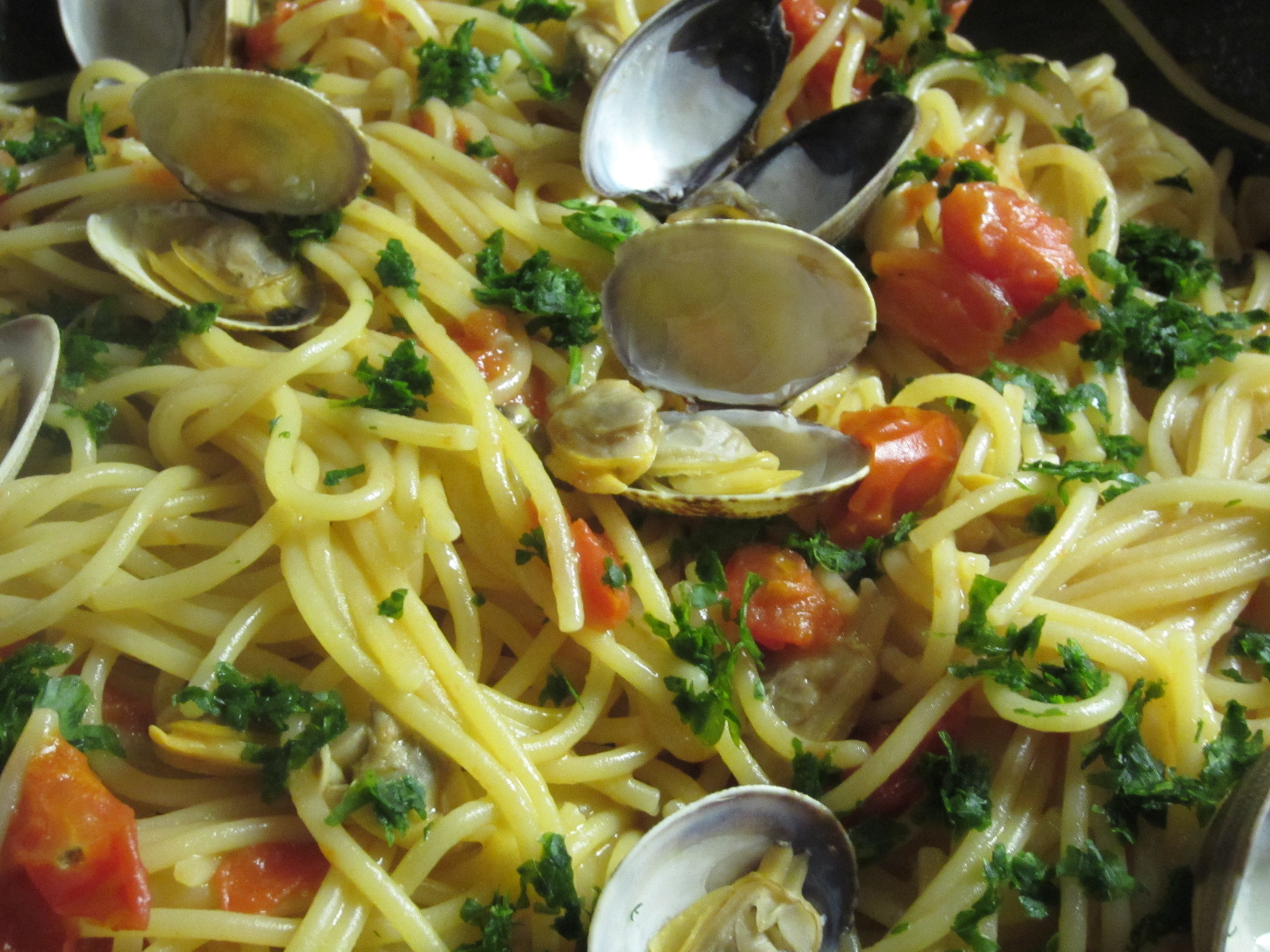 for each person 70 grams of spaghetti or linguine , 1/2 clove of garlic , a handful of parsley , half a cup of cherry tomatoes, 2 tbsp olive oil extra light green and of course the fresh clams in their shells 1 small bowl per person .