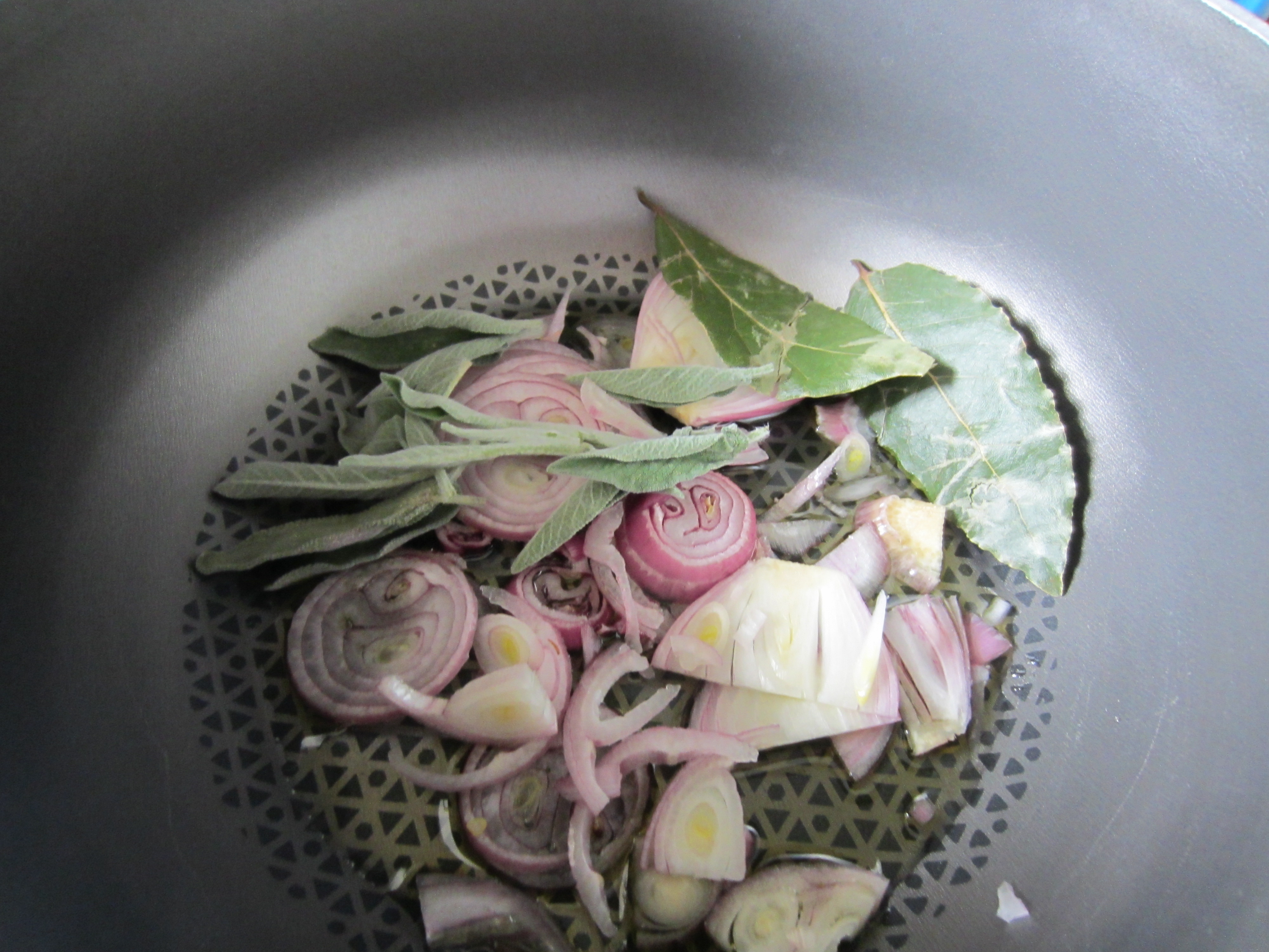 In a nonstick pan place the oil , the sliced shallot, bay leaves and sage leaves .