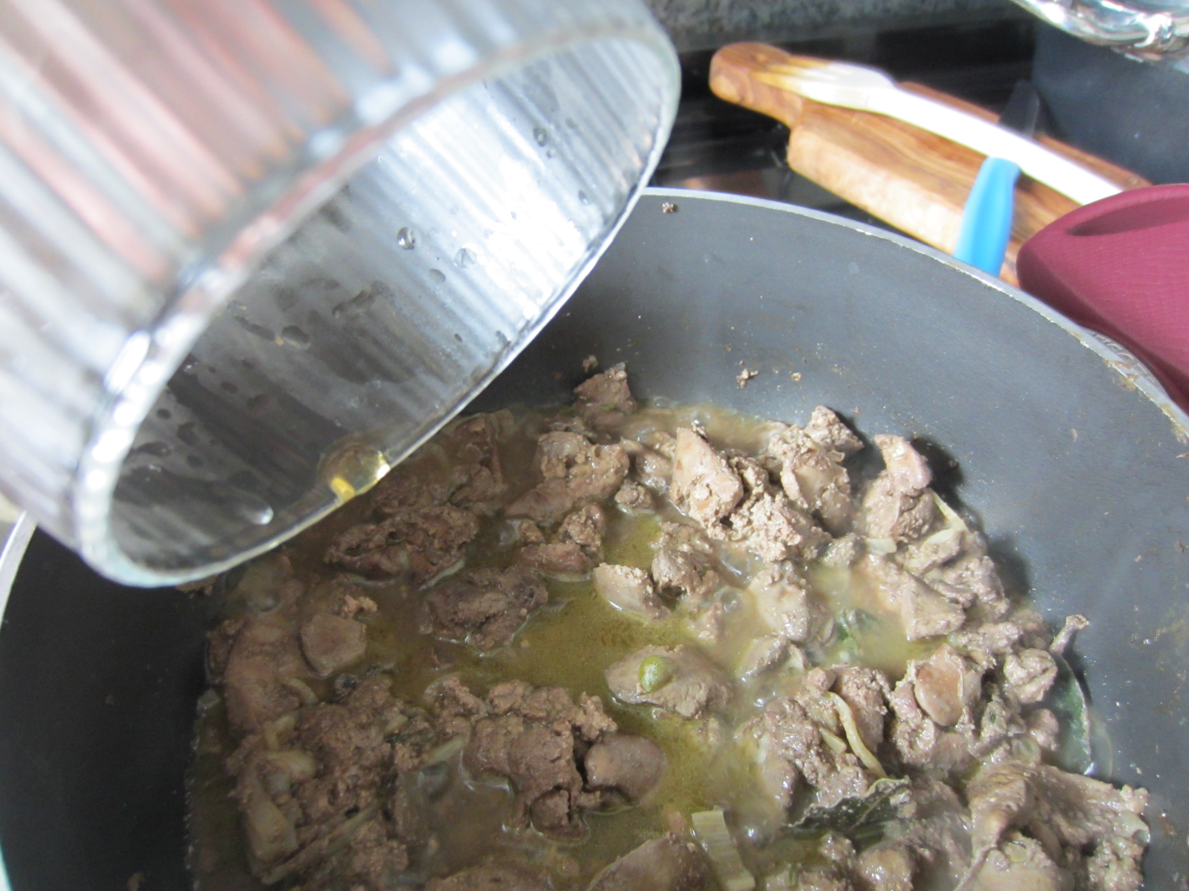 Let dry thoroughly and then add the chopped chicken livers.