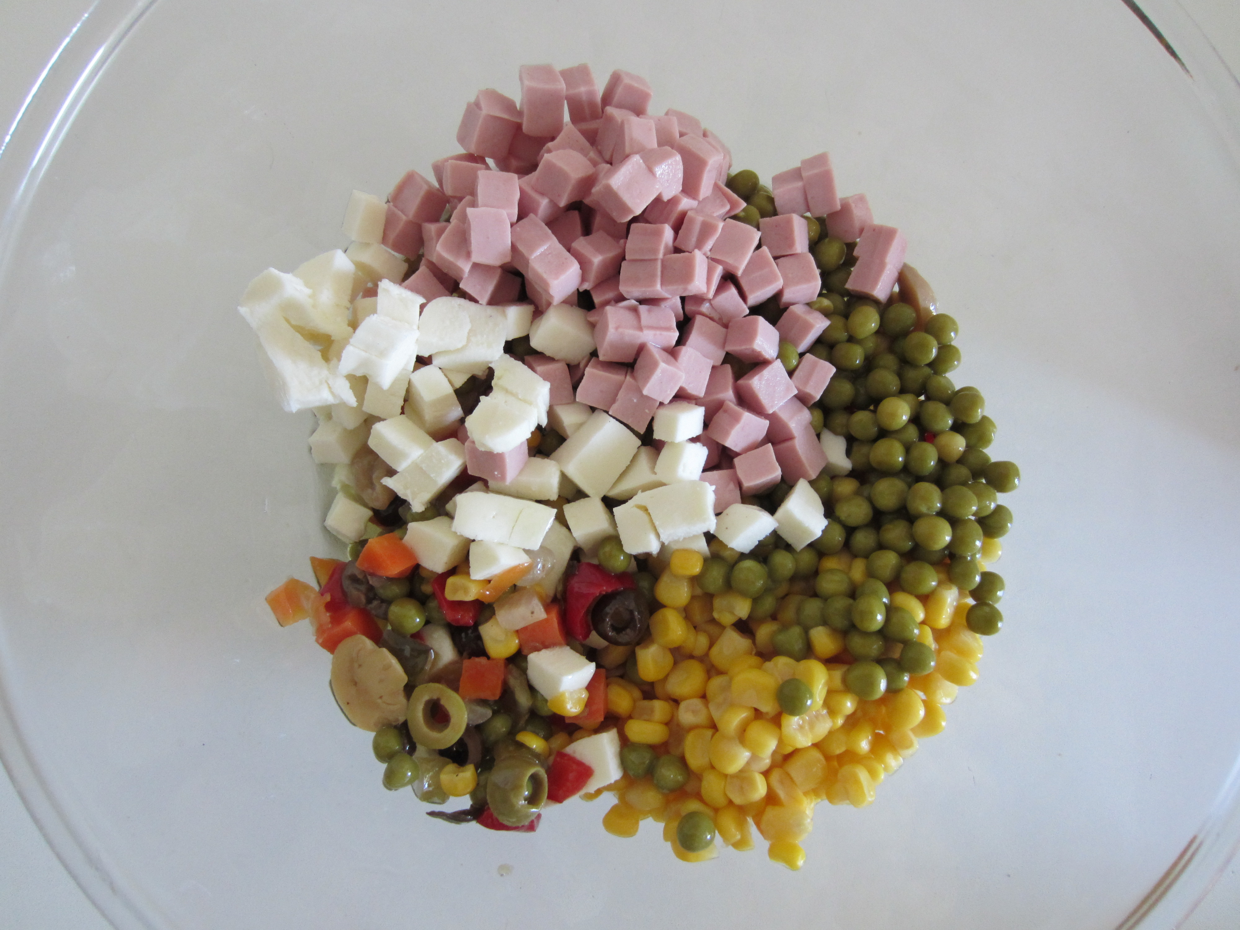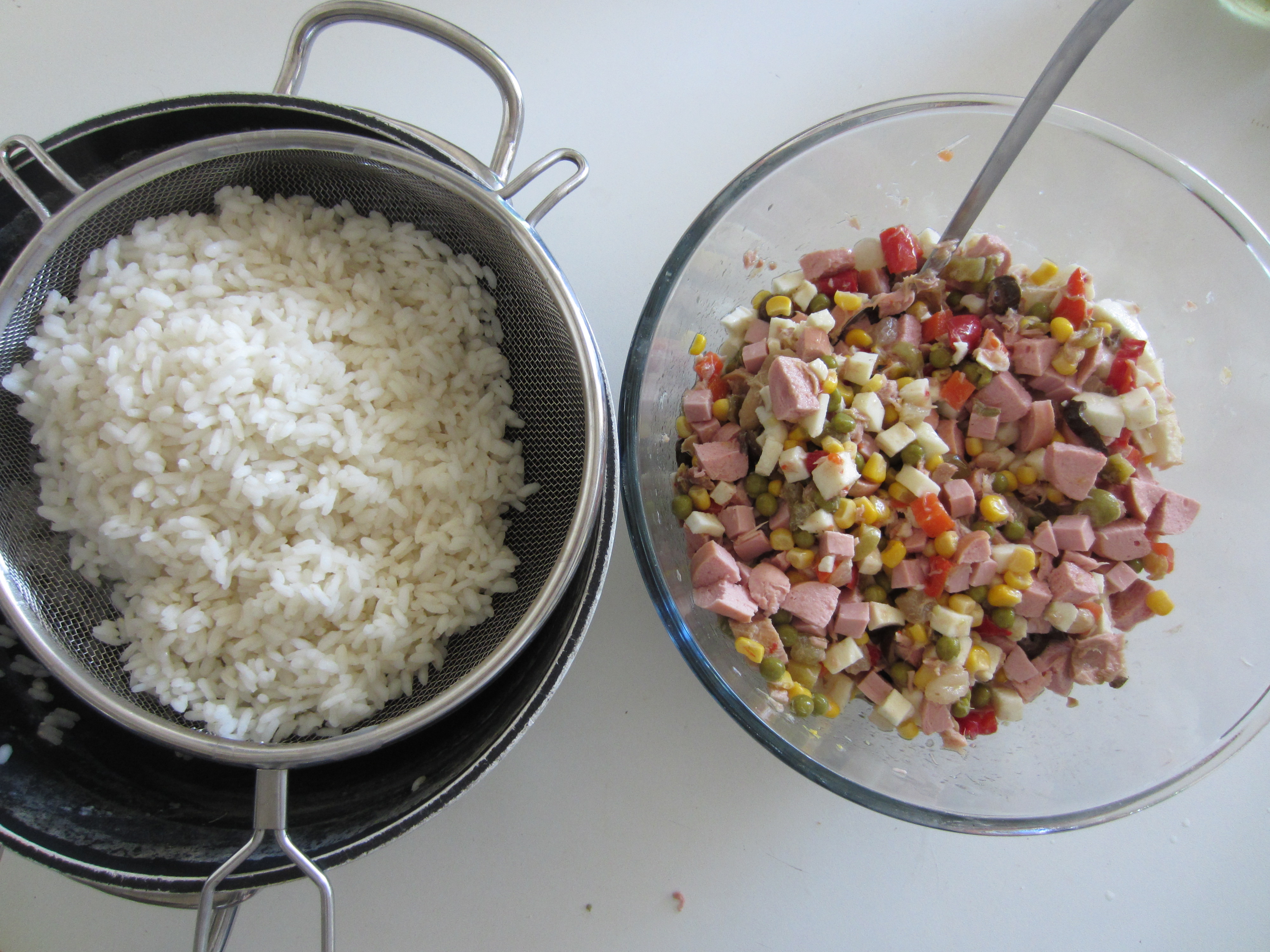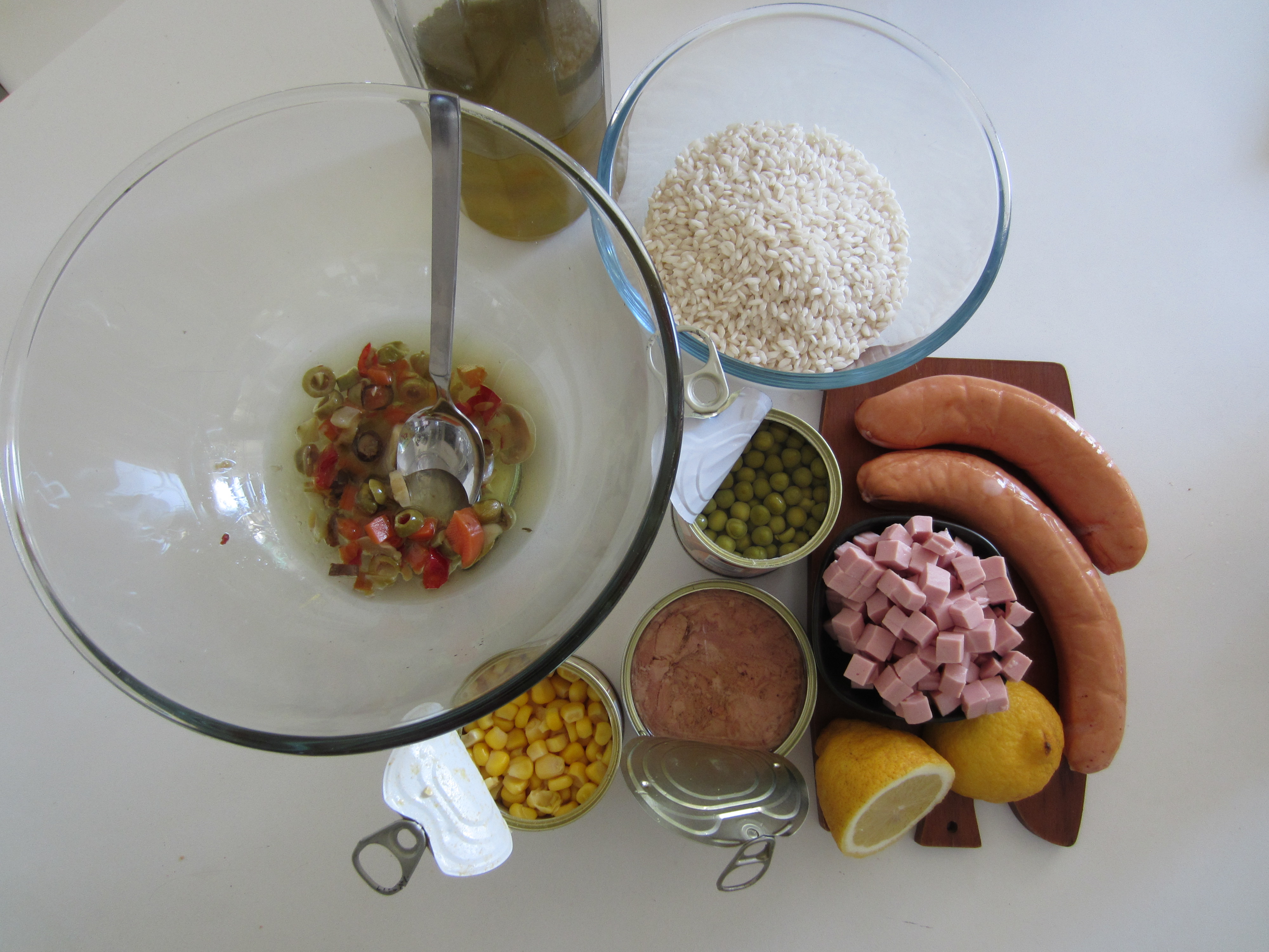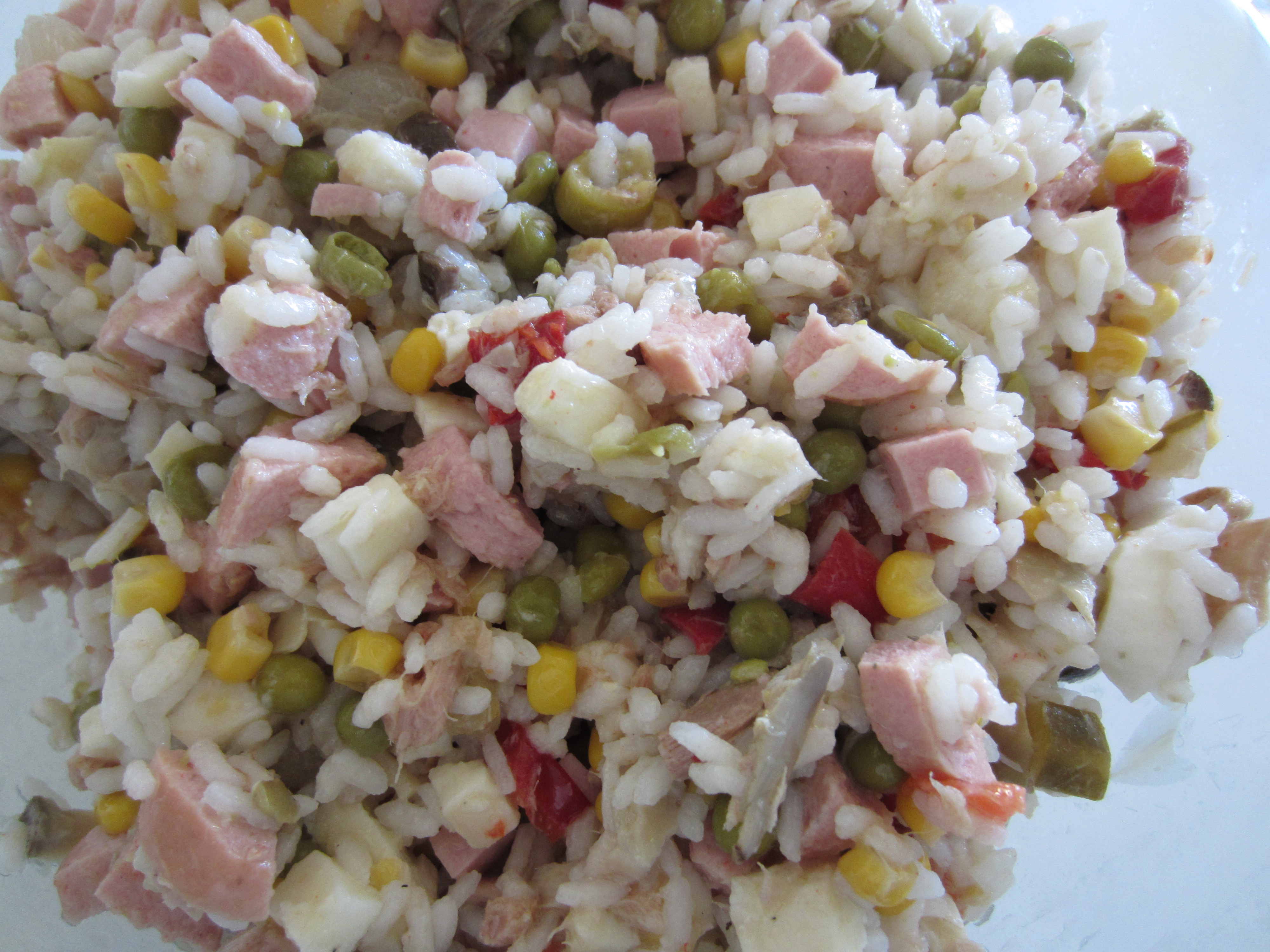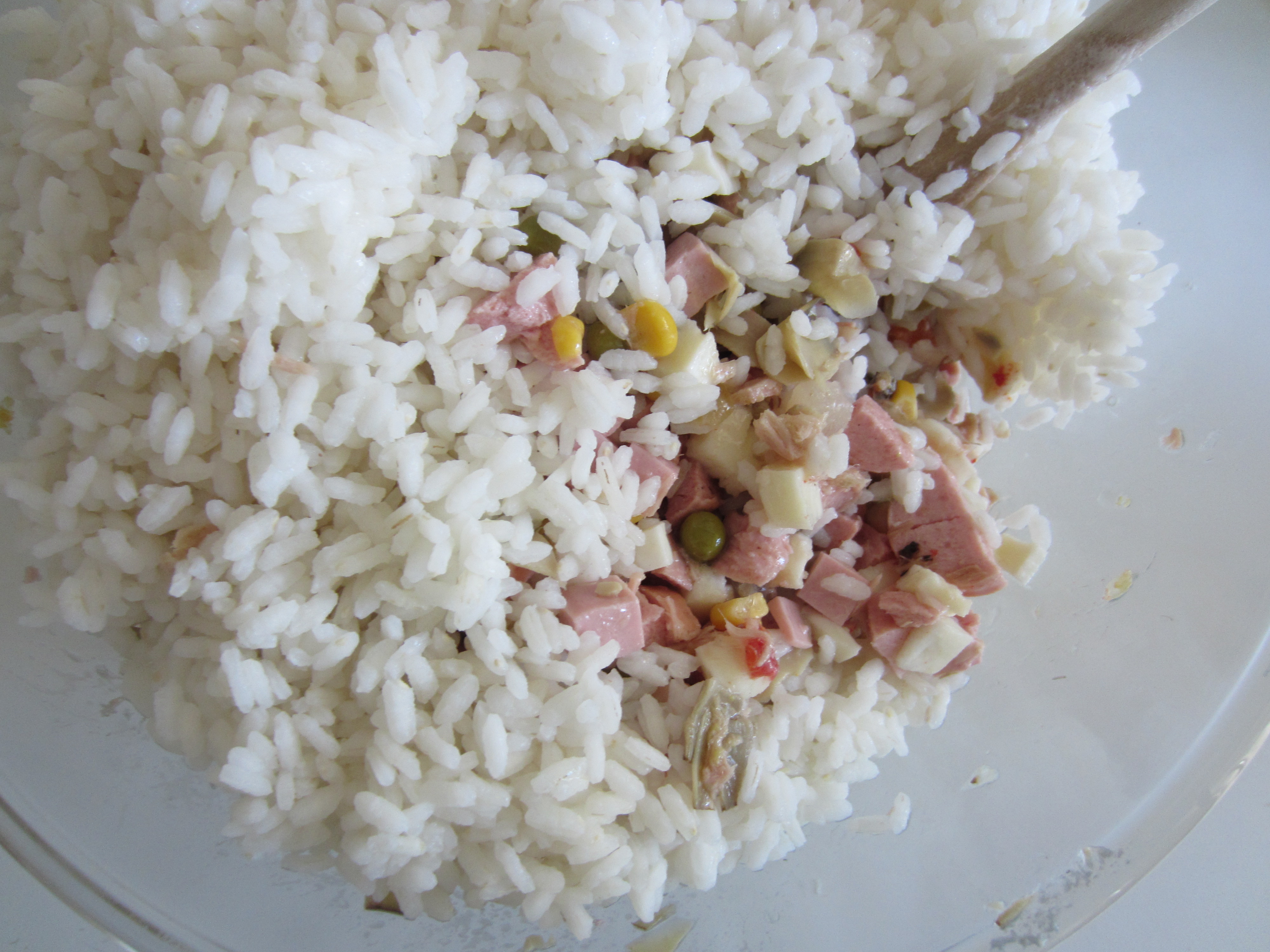 2 cups of rice , 1 cup of mixed vegetables in olive oil , 1 small can of peas , 1 small can of corn , 2 vienna sausages , 1/ 2 cup diced ham , 1 can of tuna in olive oil , 1 piece of cheese sweet – I use mozzarella for pizza, but may also use the gruyere or other cheese that is not too strong and not too seasoned – Salt and extra virgin olive oil to taste.