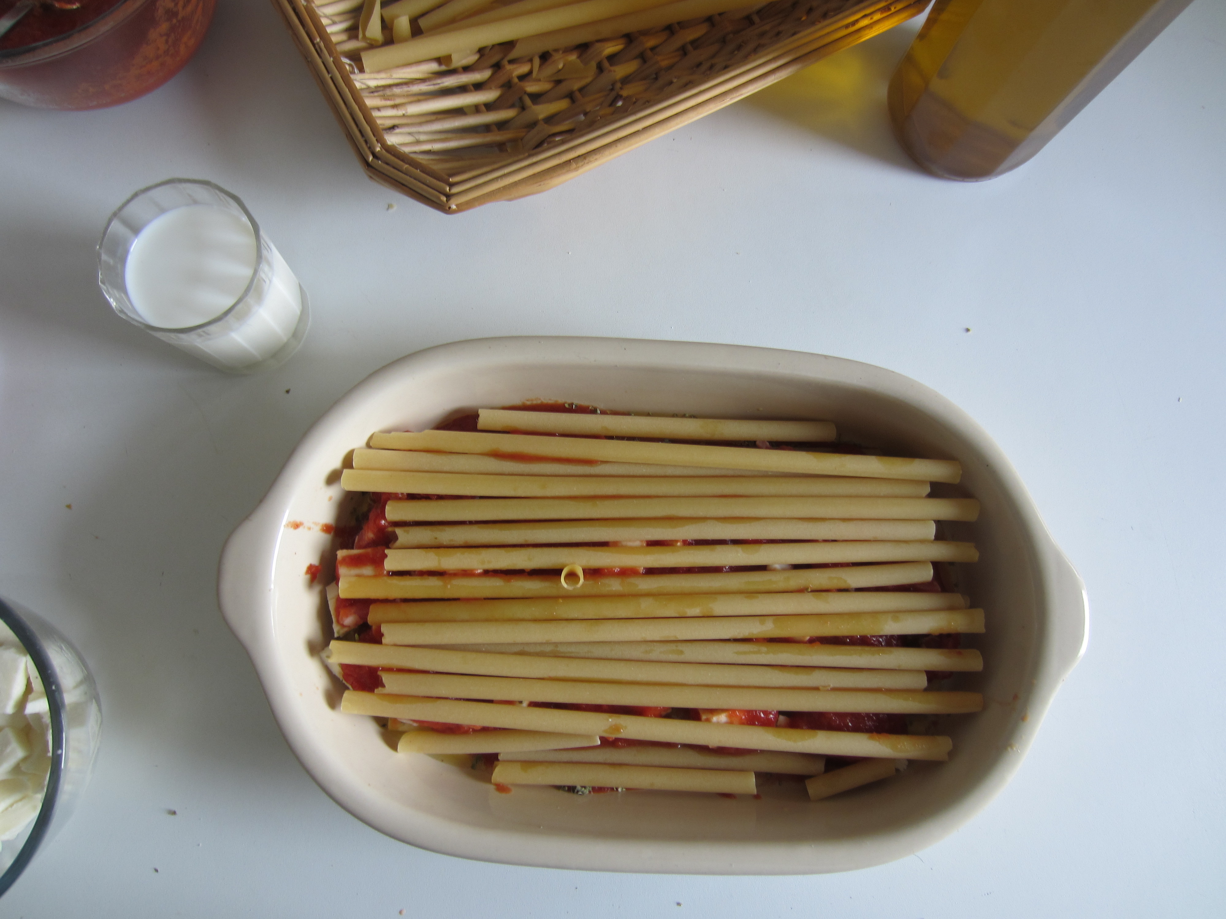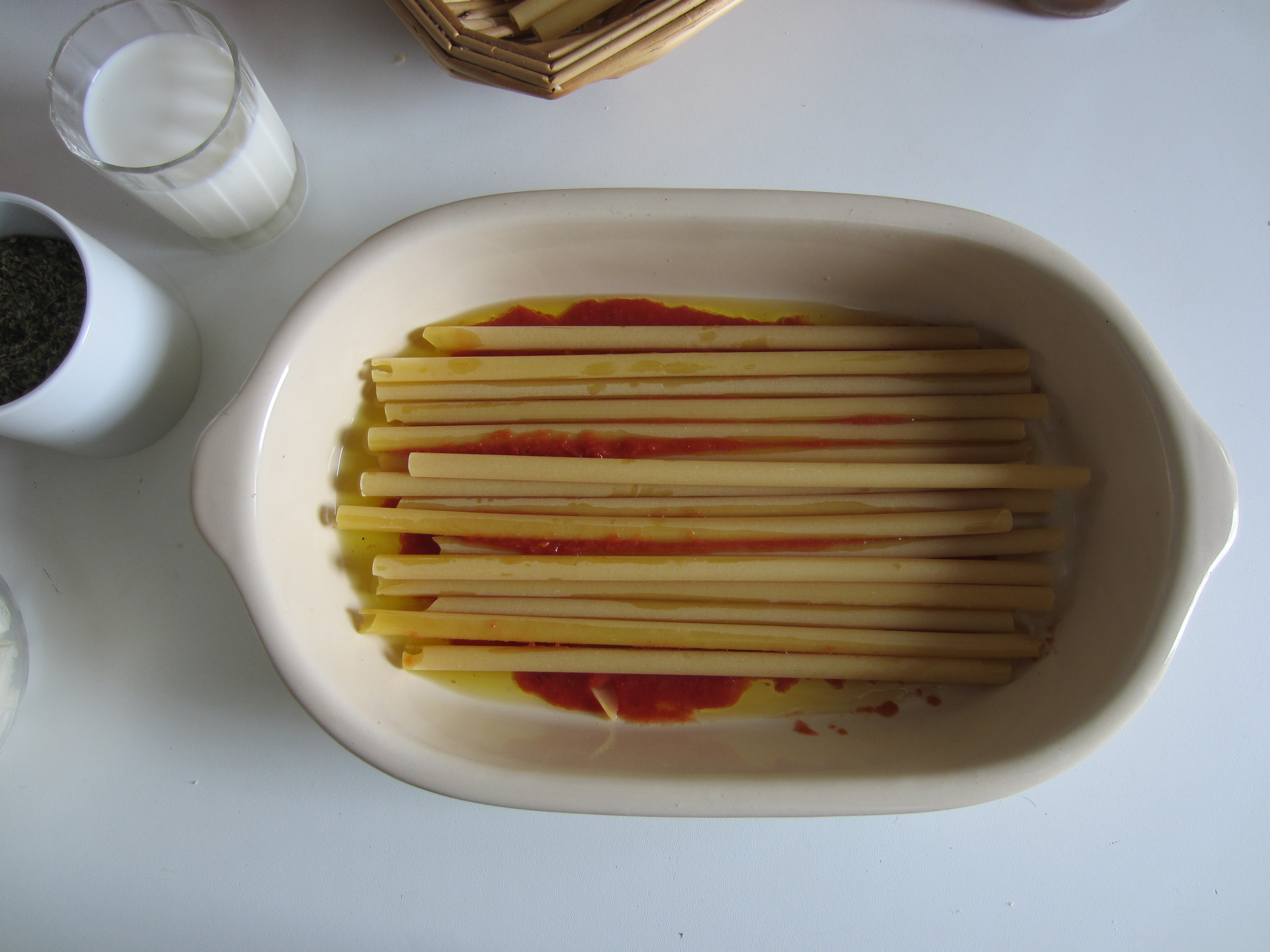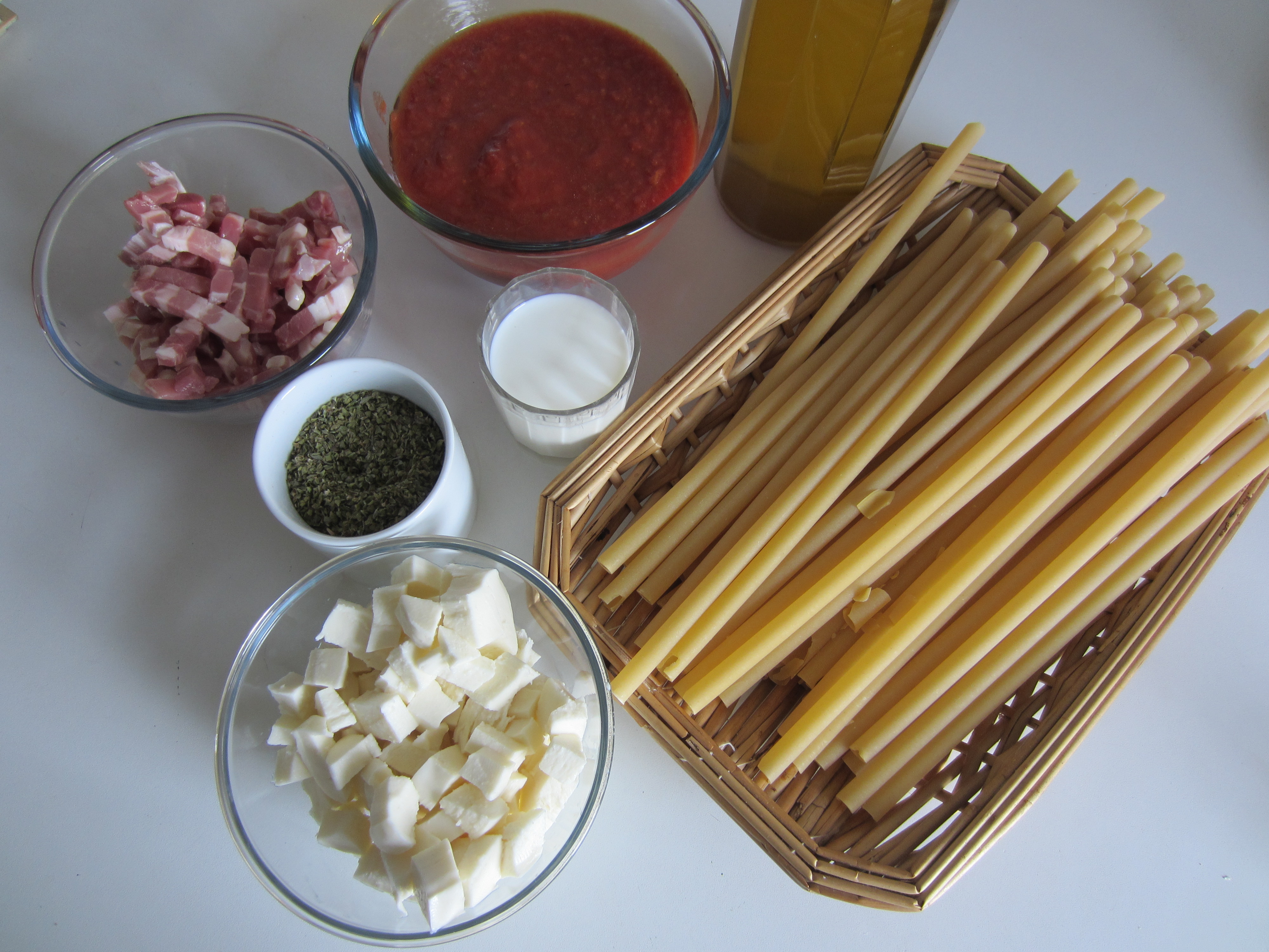 500 grams of ziti or other pasta like penne or macaroni (pasta cylindrical and perforated ) , 2 large cups of tomato passata , 1 cup of milk , 4 tablespoons of oregano, a large cup of mozzarella for pizza, half a cup of diced bacon, 4 tablespoons extra virgin olive oil , 4 tablespoons grated Parmesan cheese.