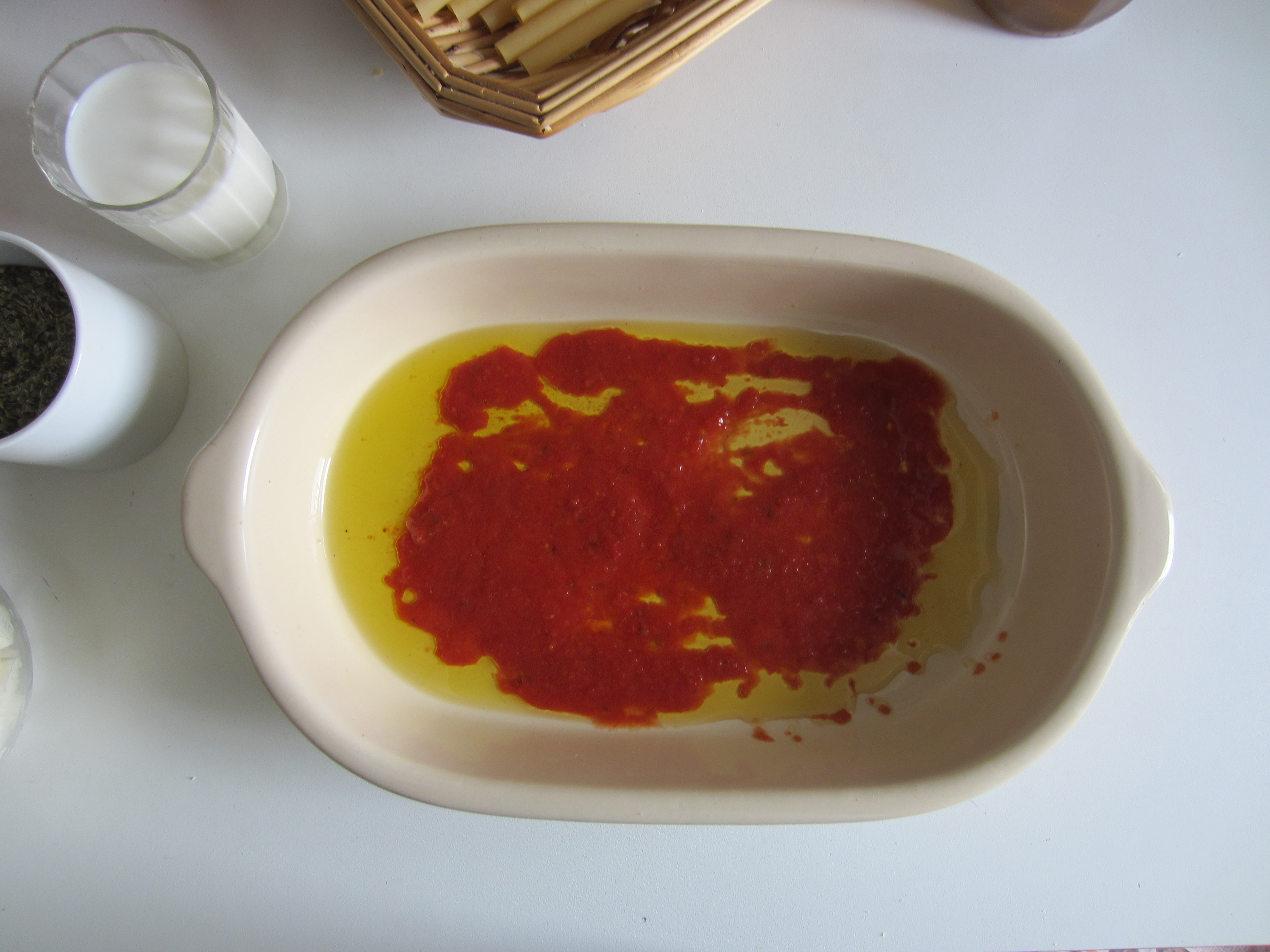 First of all, turn the oven to 180 degrees C ( degrees F) , then cut the mozzarella into cubes, grease a baking sheet with the olive oil and add 3 tablespoons of tomato passata.
