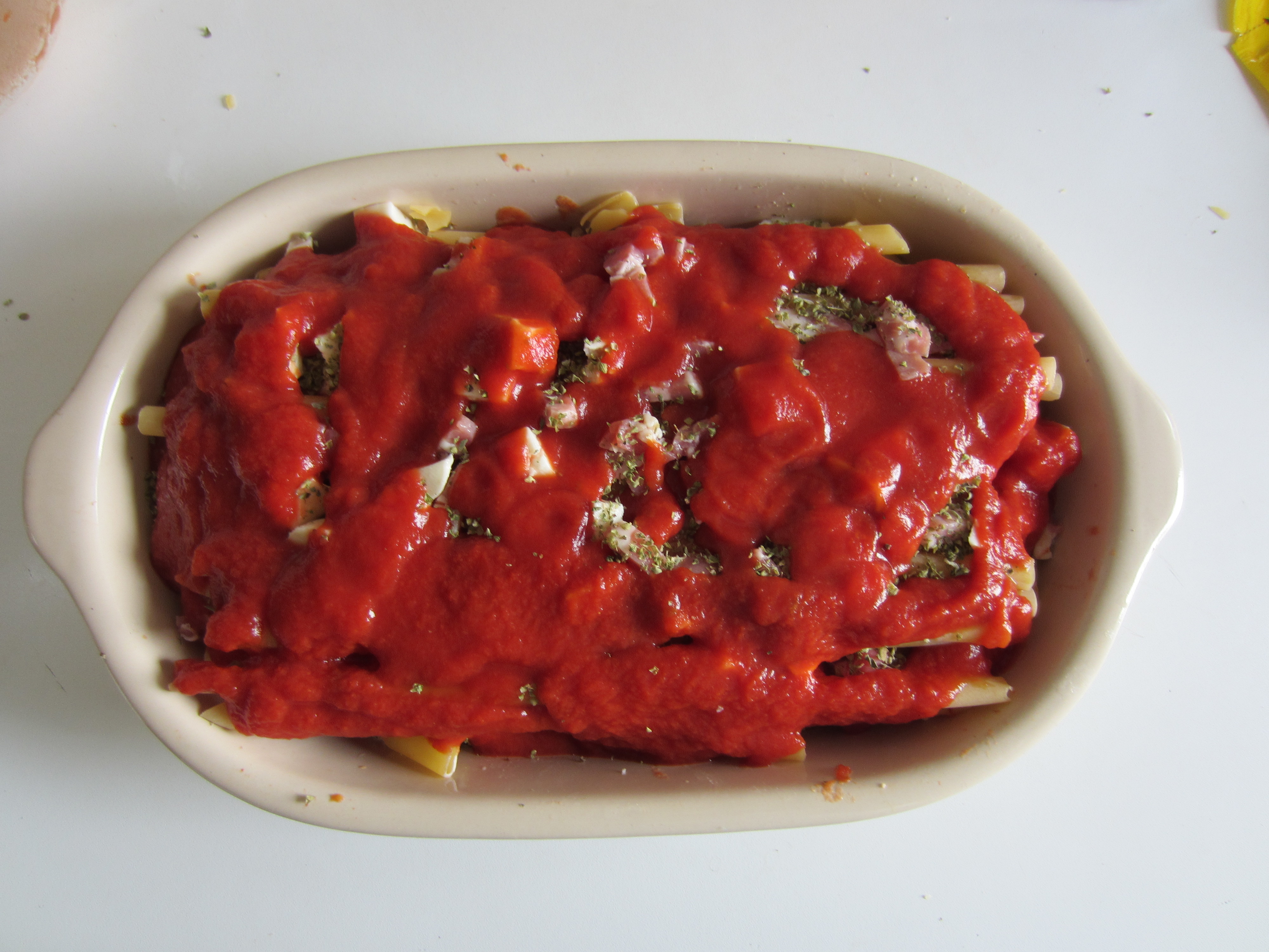 Continue making two or three layers always alternating pasta, mozzarella and bacon , oregano and passata.