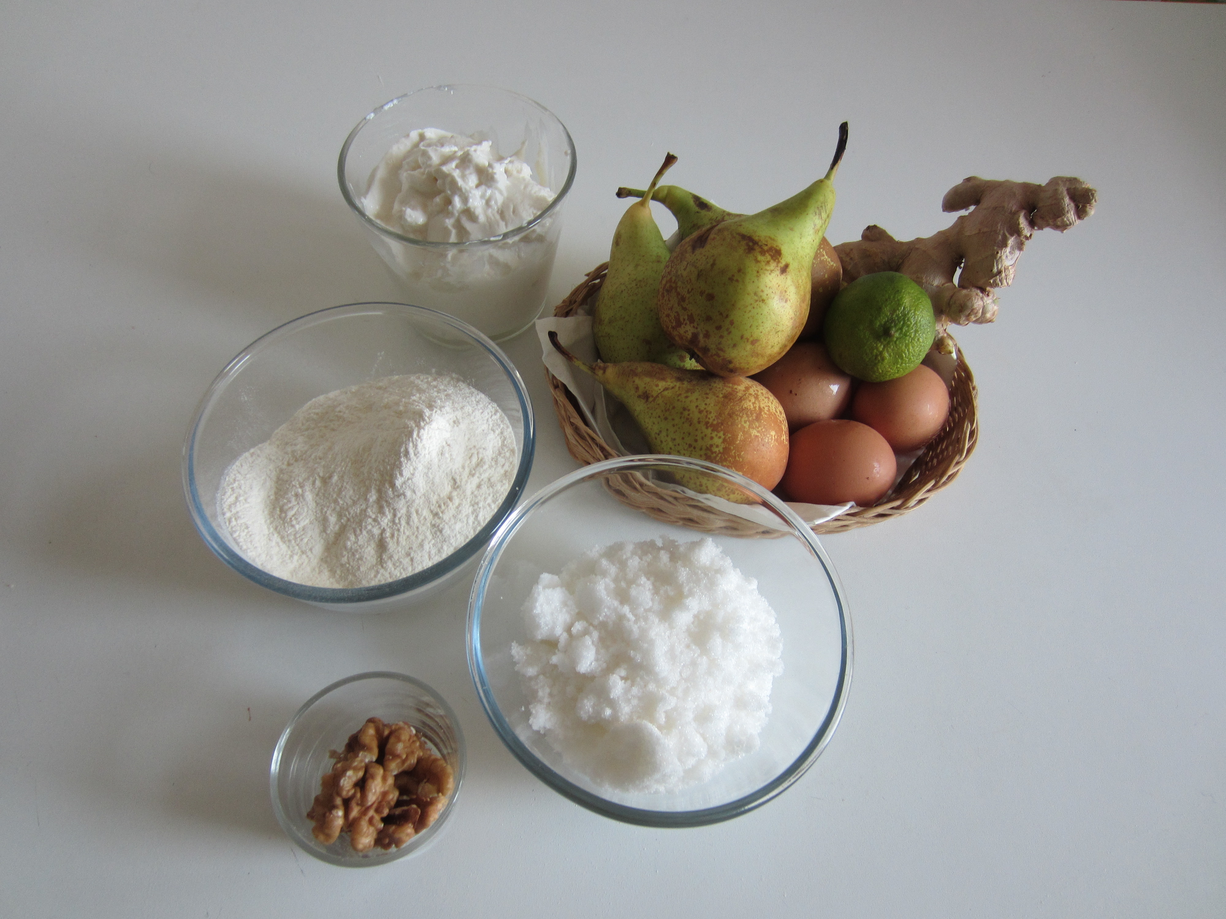 350 grams (4 cups) ricotta cheese, 4 ripe pears, 10 walnuts, 1 lime, ginger, 280 grams (4 cups) of flour, 180 grams (2 cups) sugar, 3 eggs, 1 teaspoon yeast.