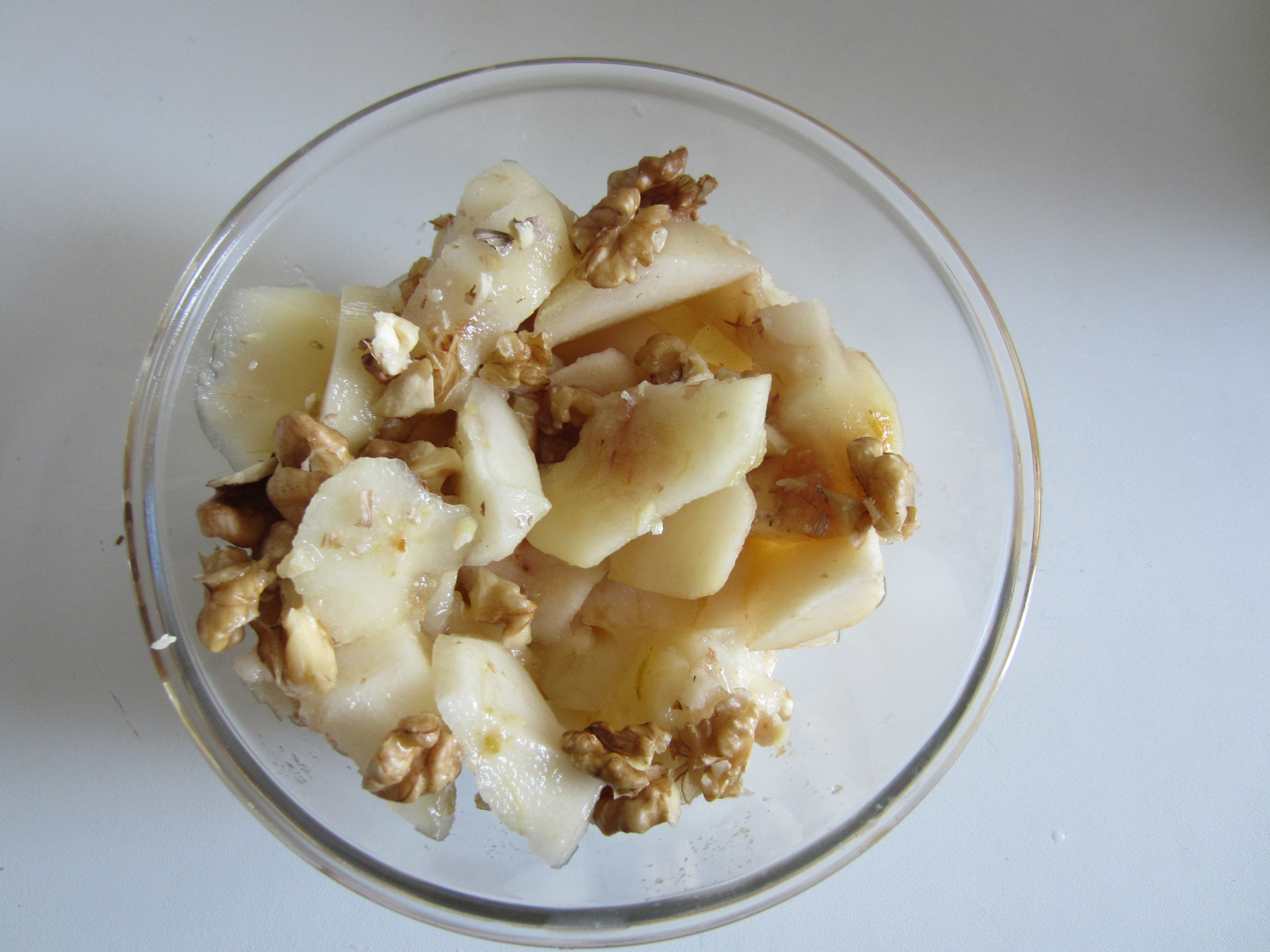 Stir in pears and walnuts with ‘any sauce that had formed and mix well.