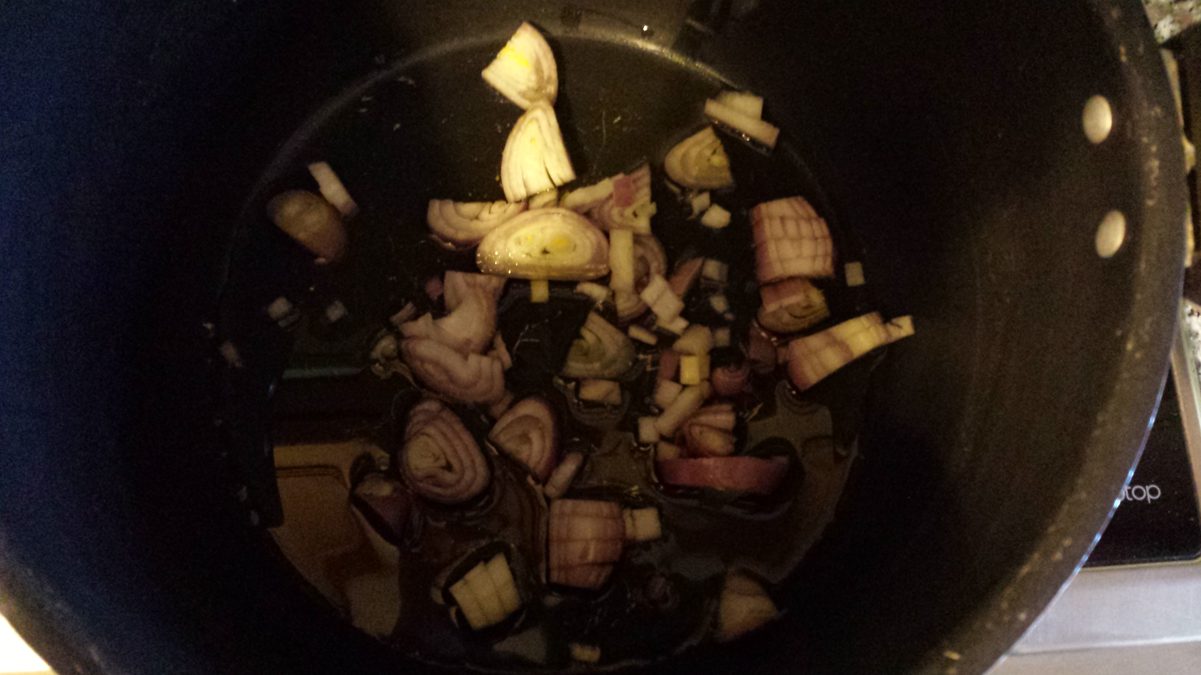 In a nonstick pan , place the oil , the chopped shallots and pieces of meat.