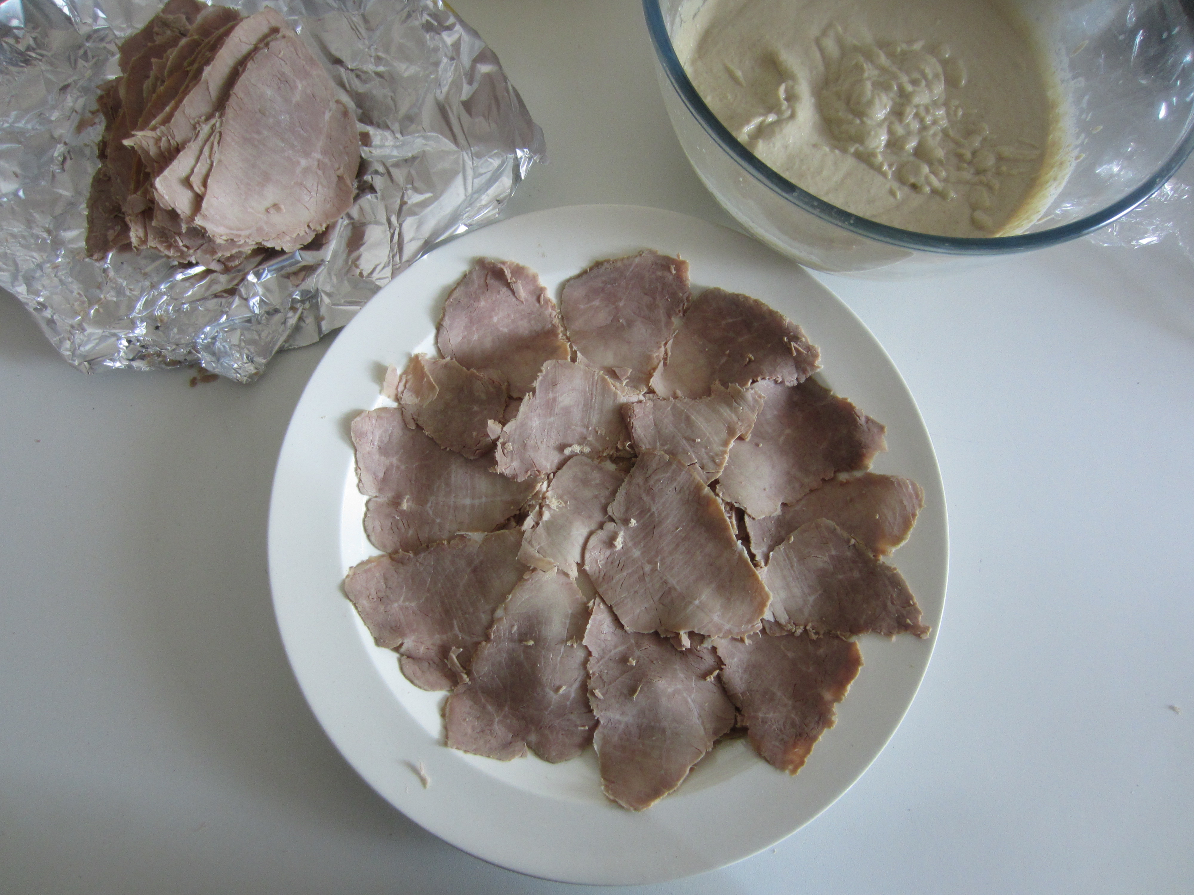 Cut the meat into thin slices, using a meat slicer if you can, place the meat on a serving dish and add the sauce on multiple layers over it.