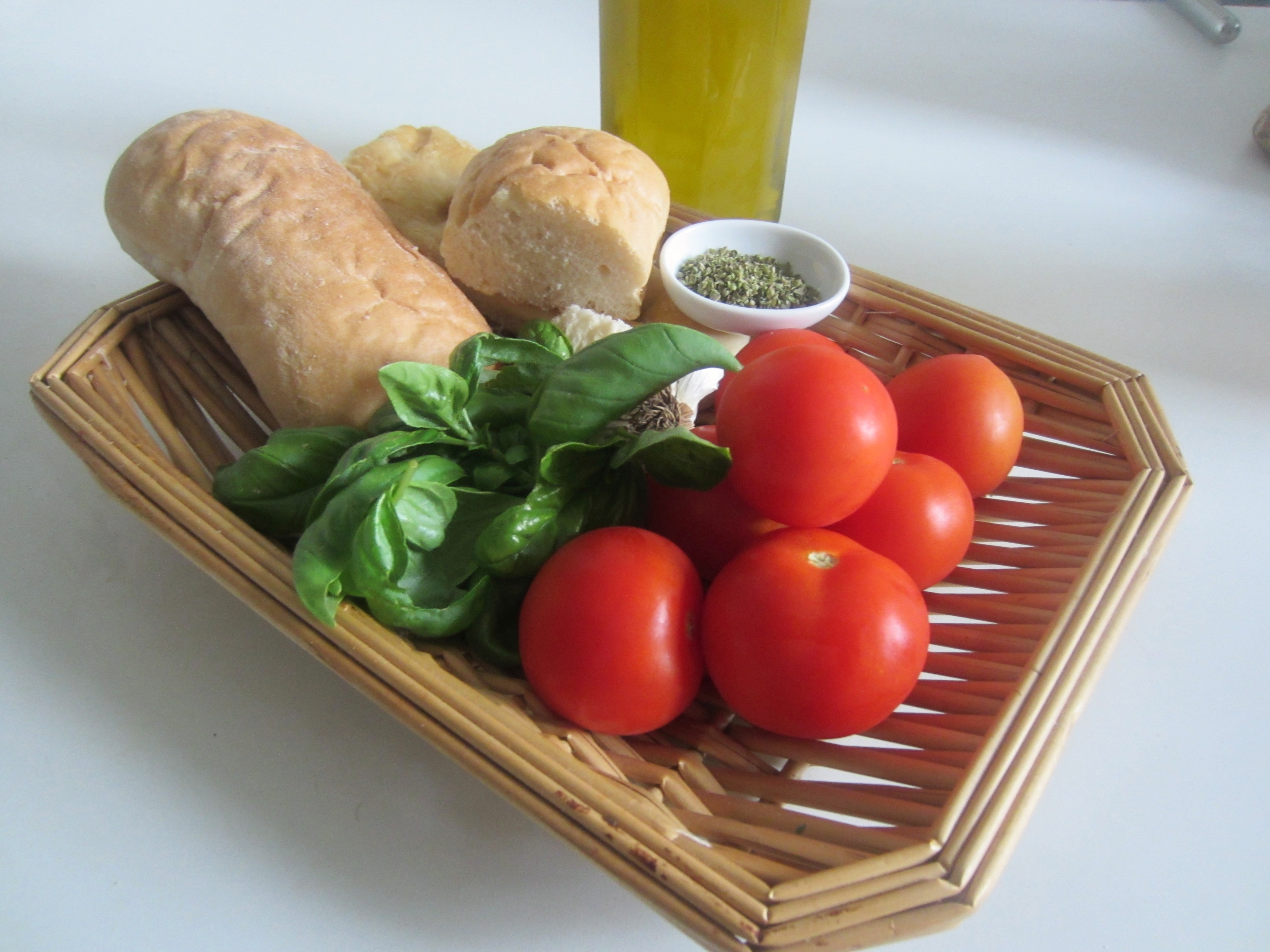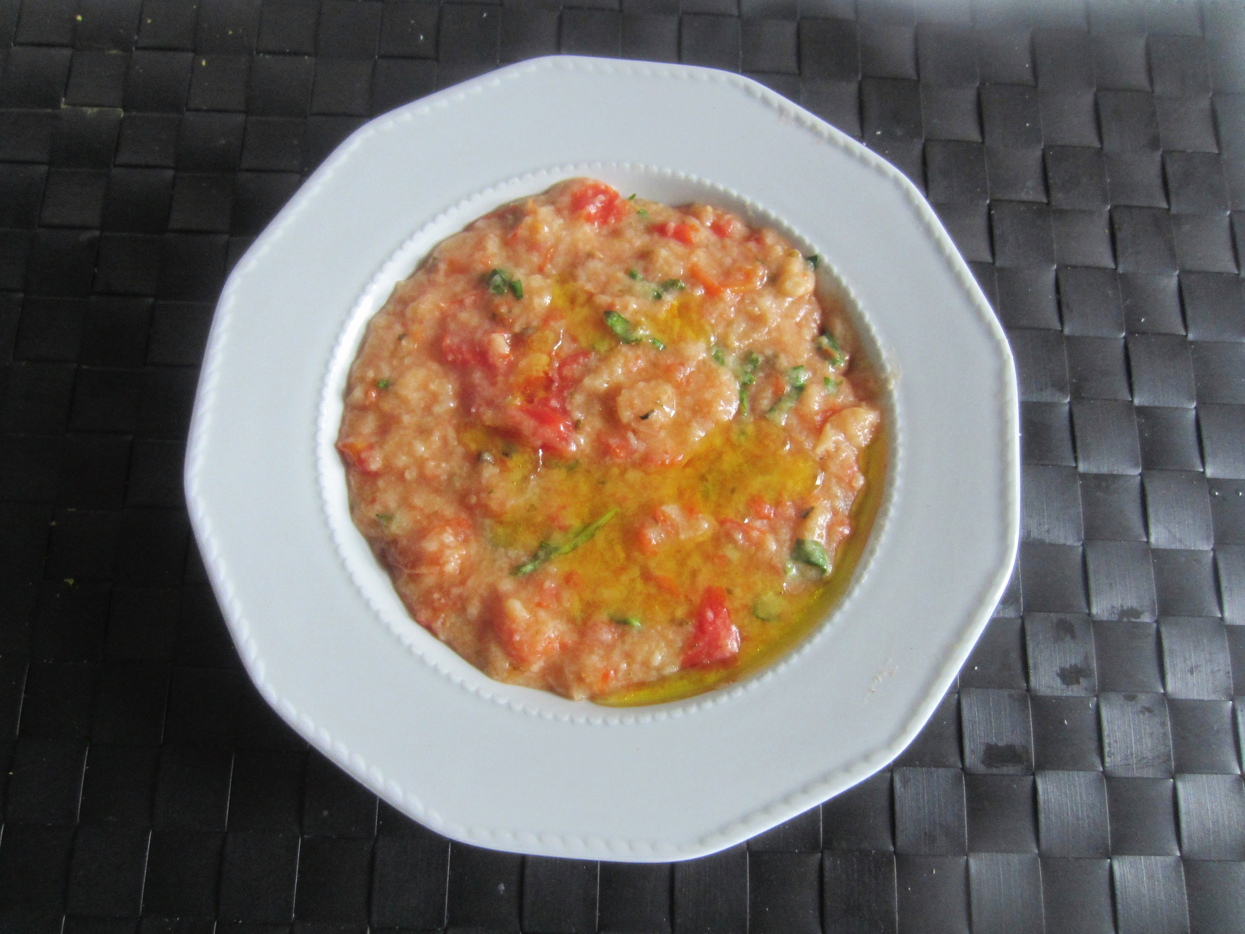 500 g of super ripe red tomatoes, 300 grams of stale bread, 2 cloves of garlic, 6 spoons of extra virgin olive, salt to taste, abundant basil, half a tablespoon of oregano and finally…. less than one hour of your time.