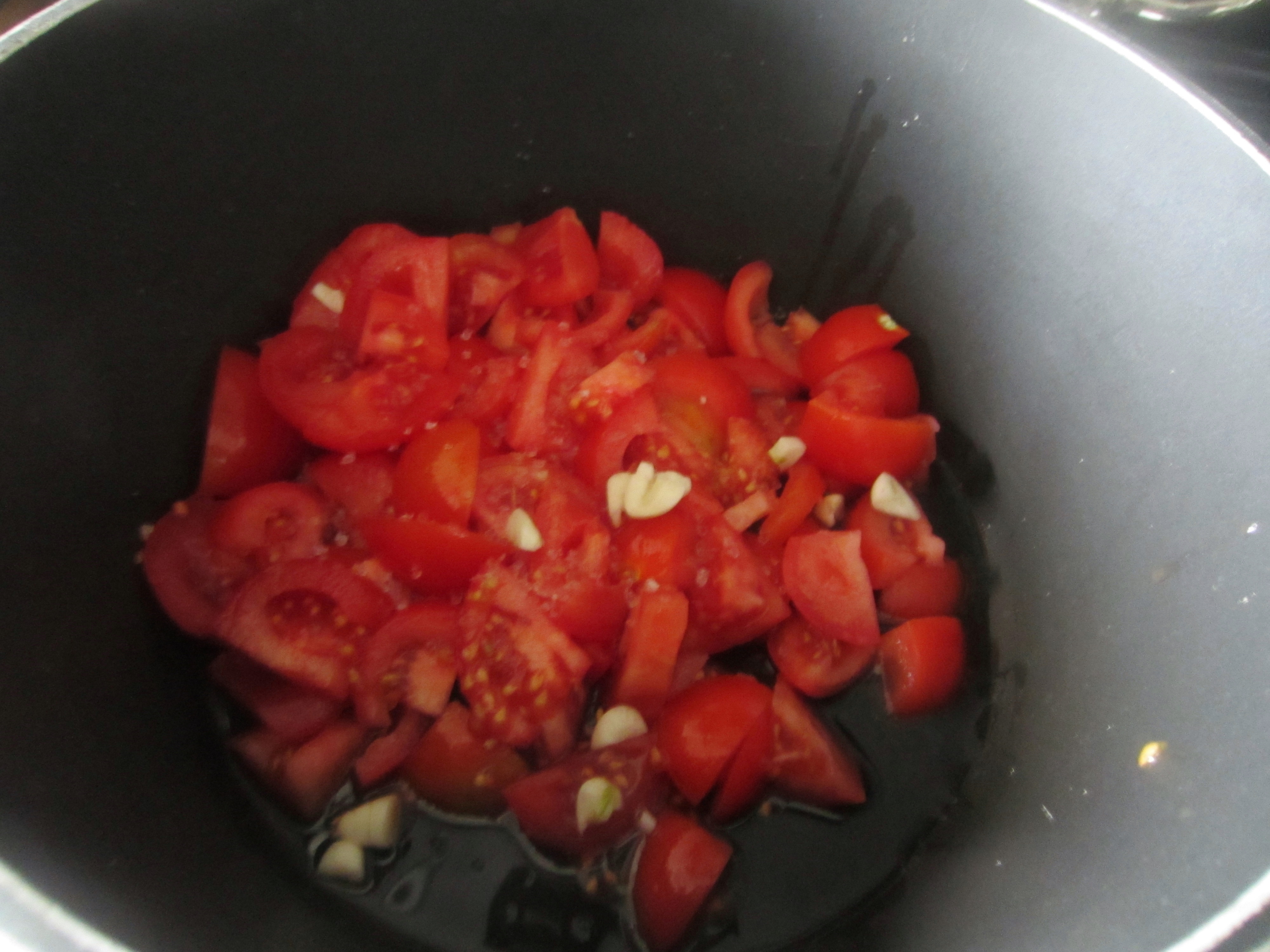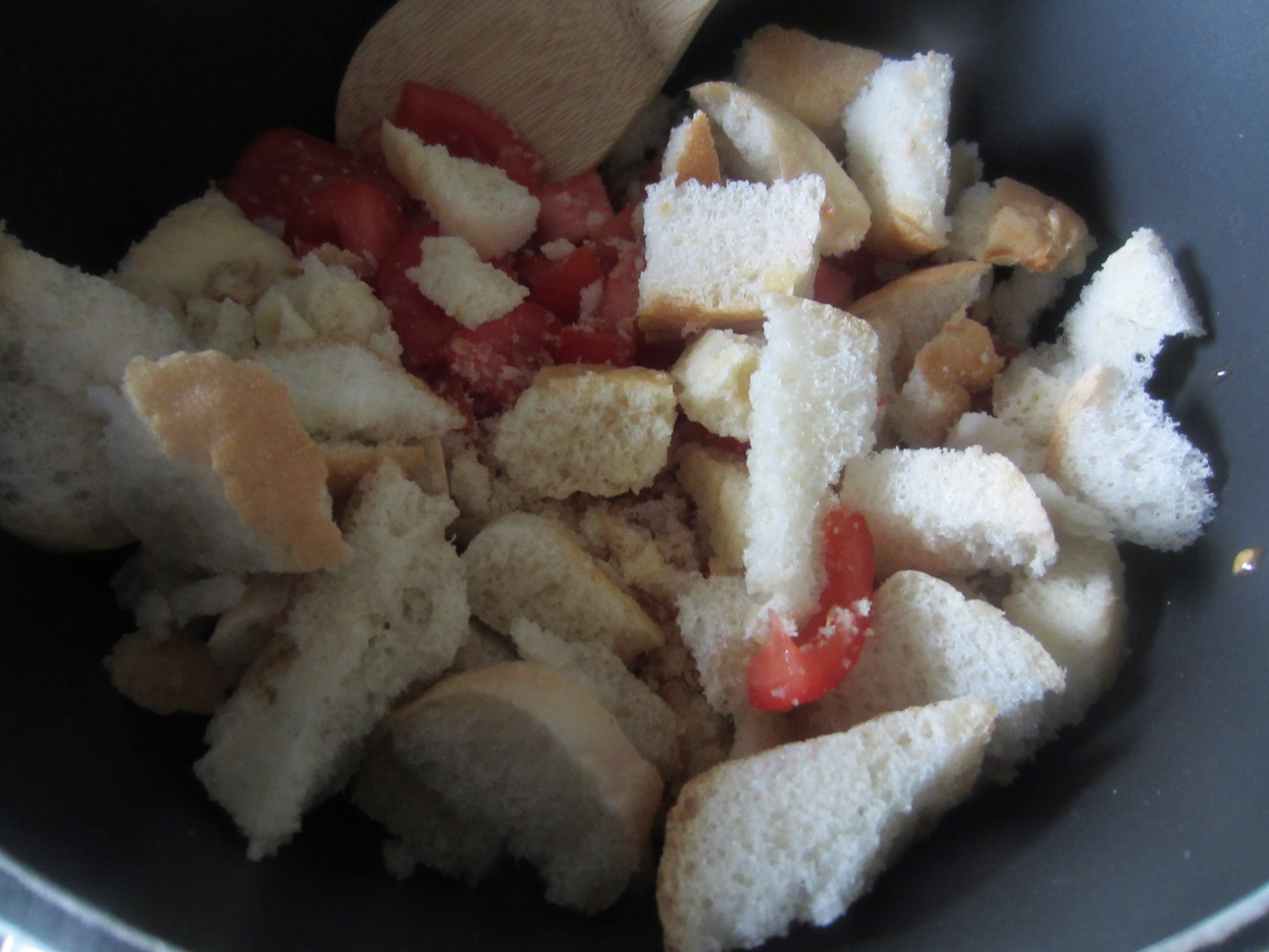 In a saucepan put 2 tablespoons of oil, then add the bread, the tomatoes and the garlic and salt to taste.
