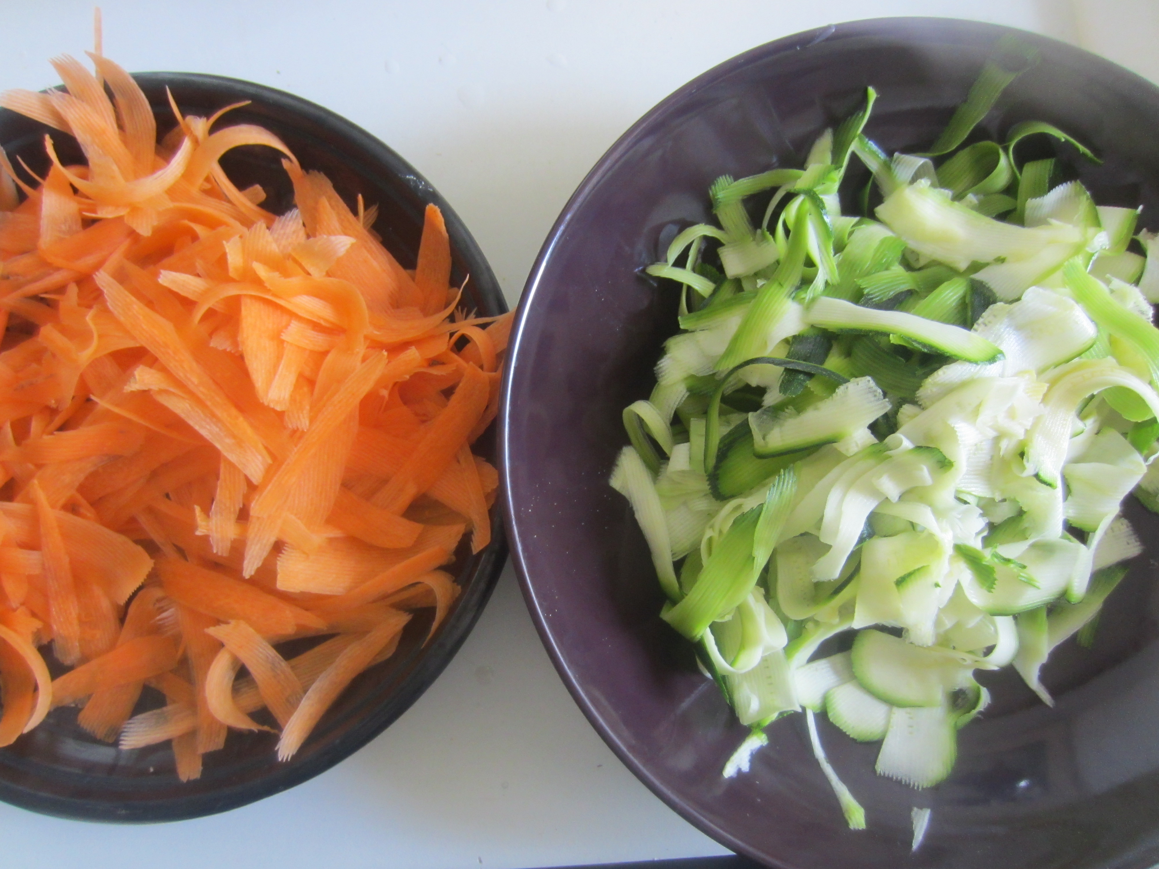 With a potato peeler cut in thin slices both carrots and zucchini.