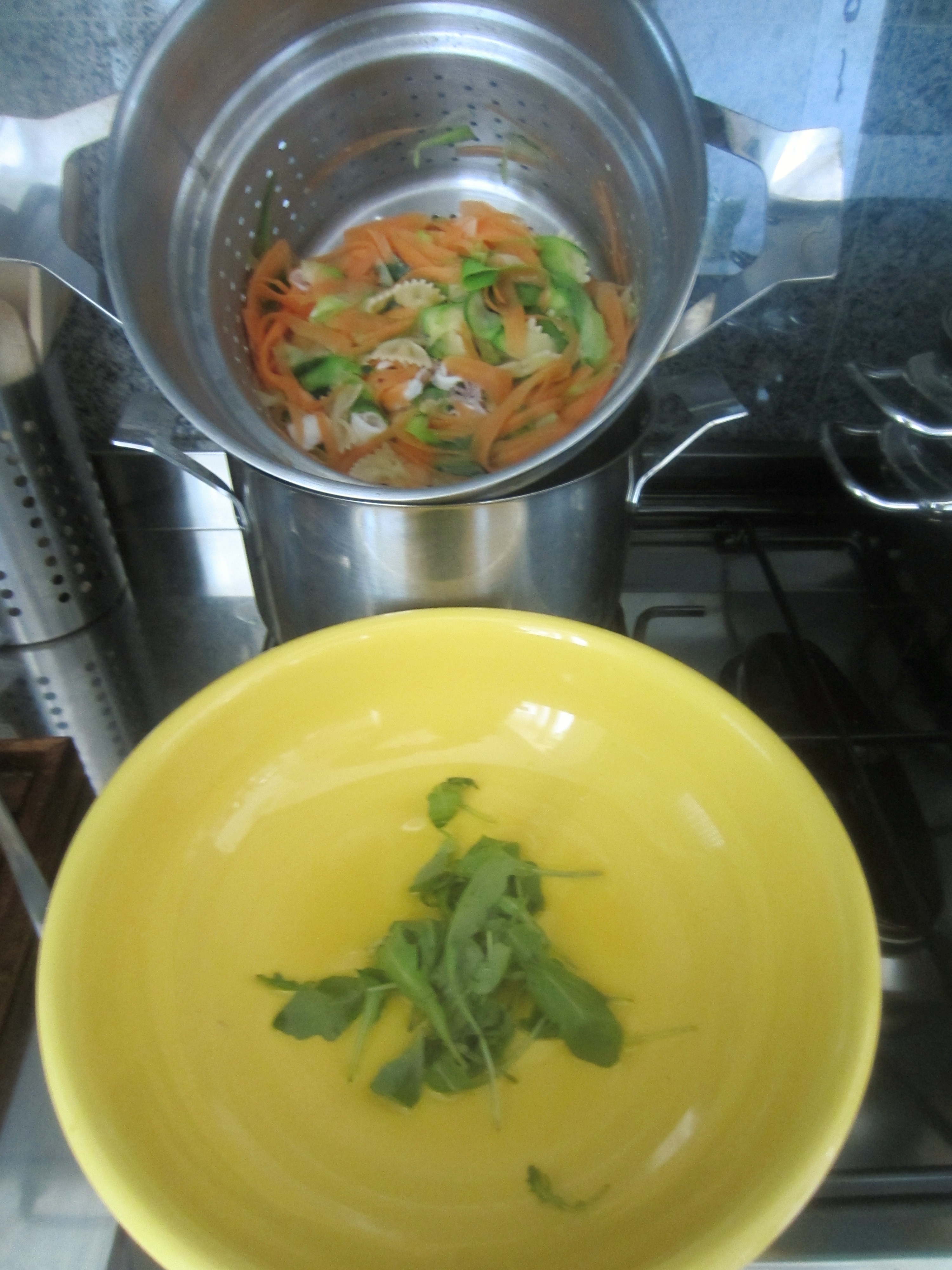 Drain thoroughly and pour it into the bowl with the arugula and oil.