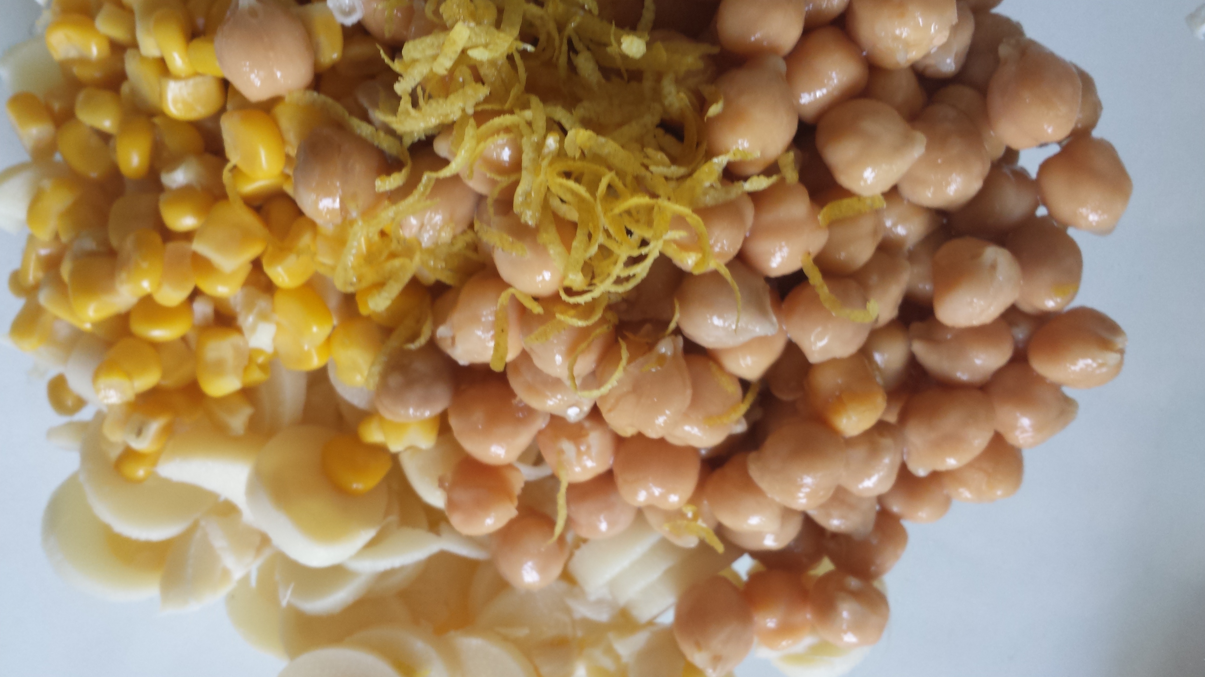 5 or 6 pieces of heart of palm, 1 organic lemon, 1 ripe avocado, 1 cup of cooked chickpeas, 1 cup of canned corn, 4 tablespoons of extra virgin olive oil, 1 tablespoon of wild mustard (the one with the seeds).