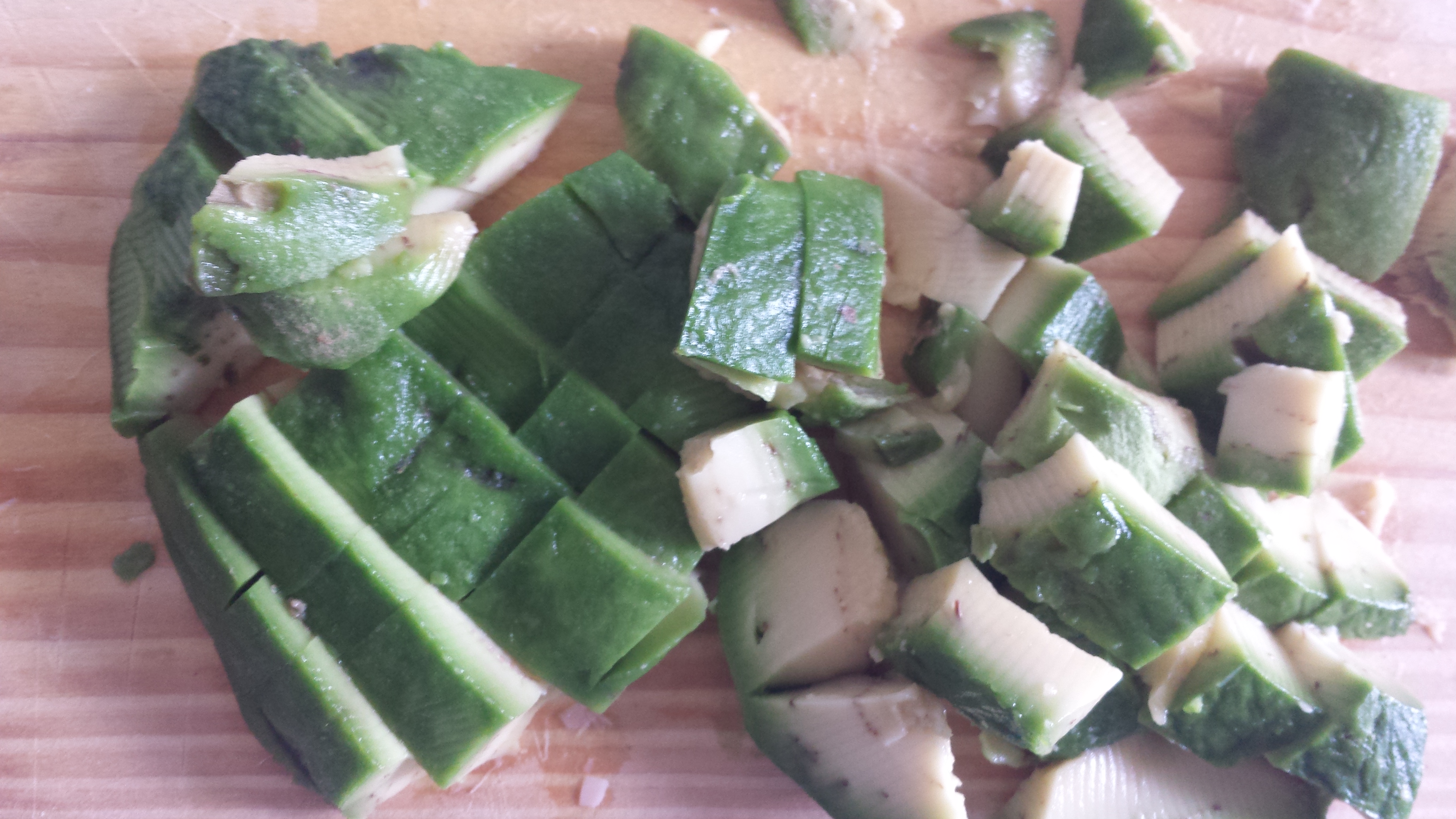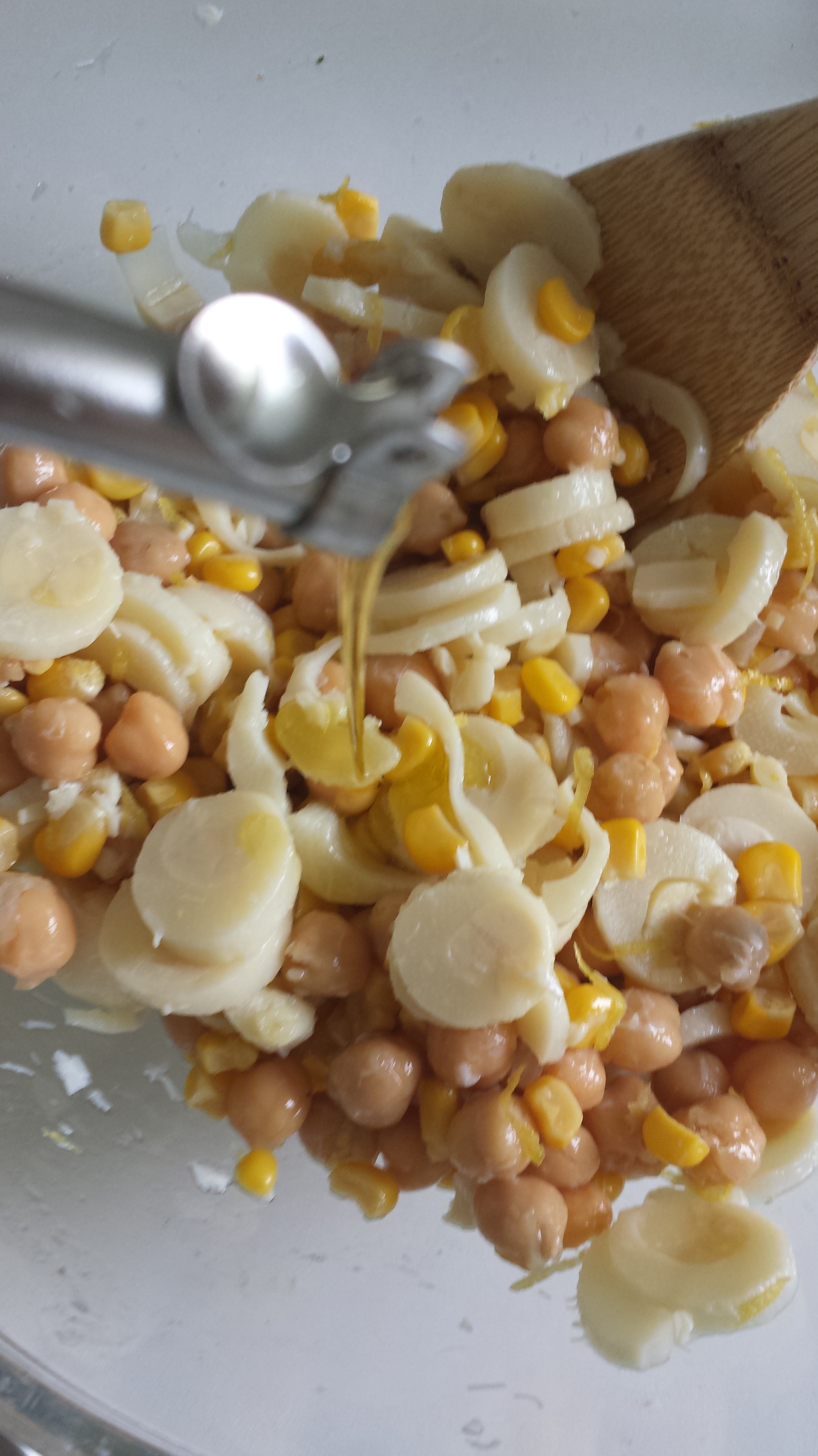 This is my way of preparing a fantastic salad by my dearest friend Susanna with heart of palm, corn, and avocado – and as personal touch I add also chickpea.