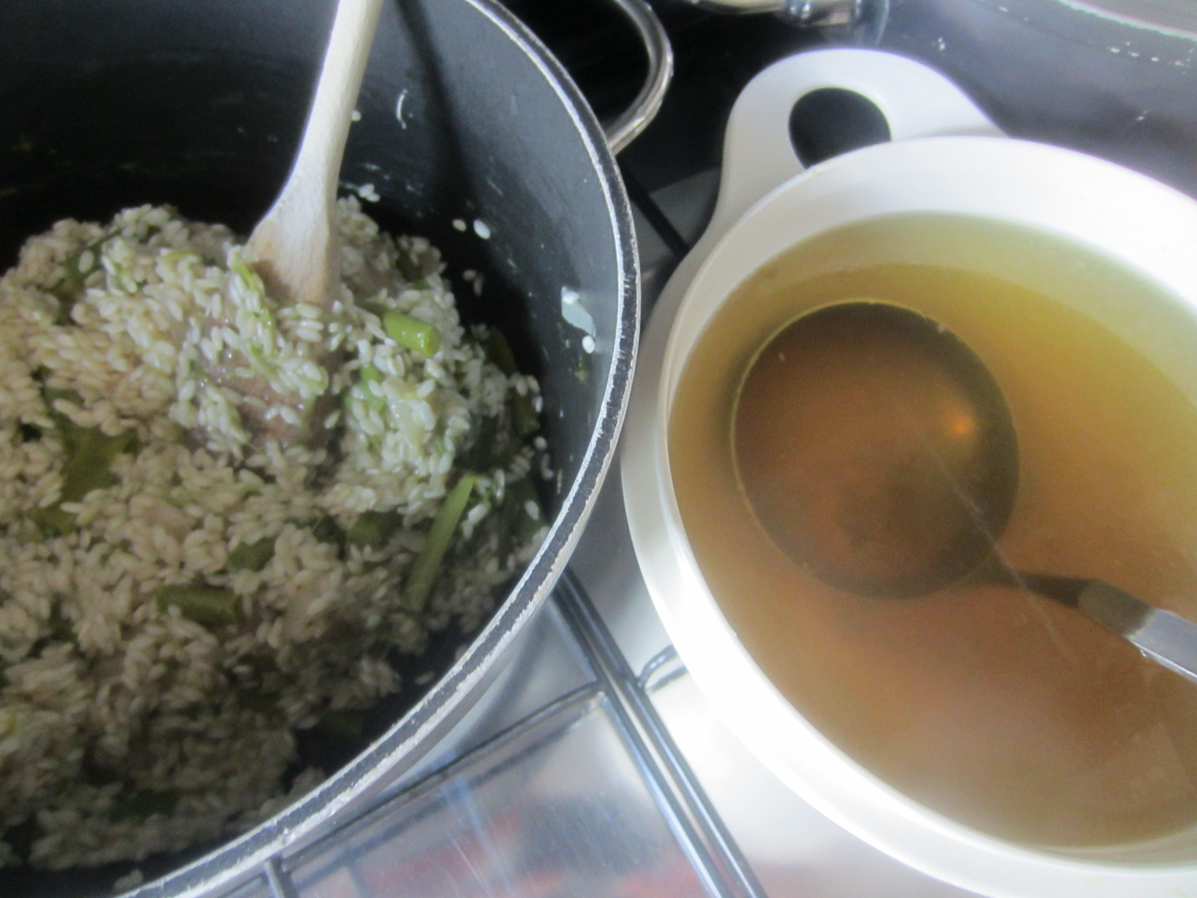 Lower the heat and add the vegetable asparagus broth a little at a time and finishing the cooking rice. It will take about 20 minutes.