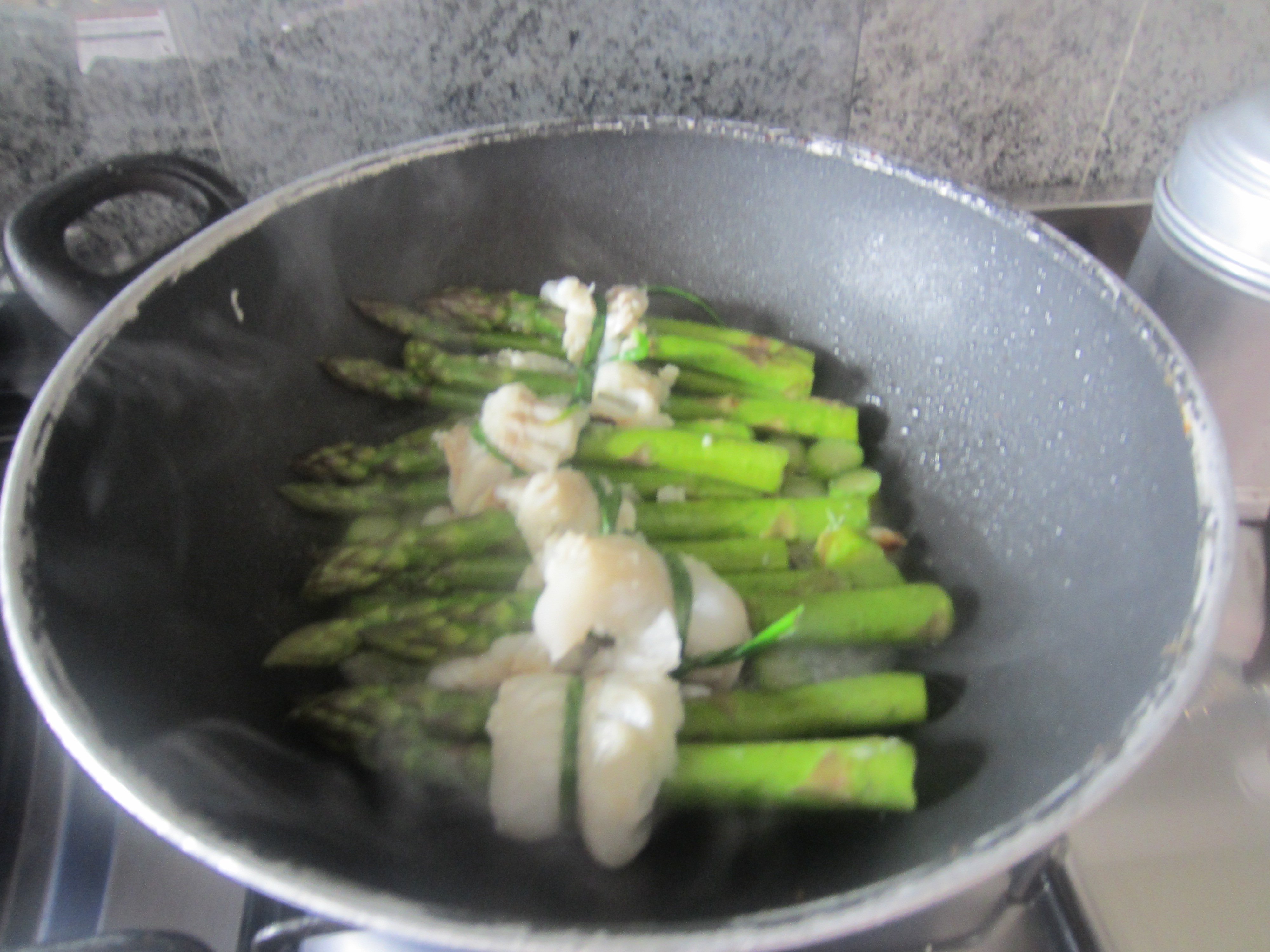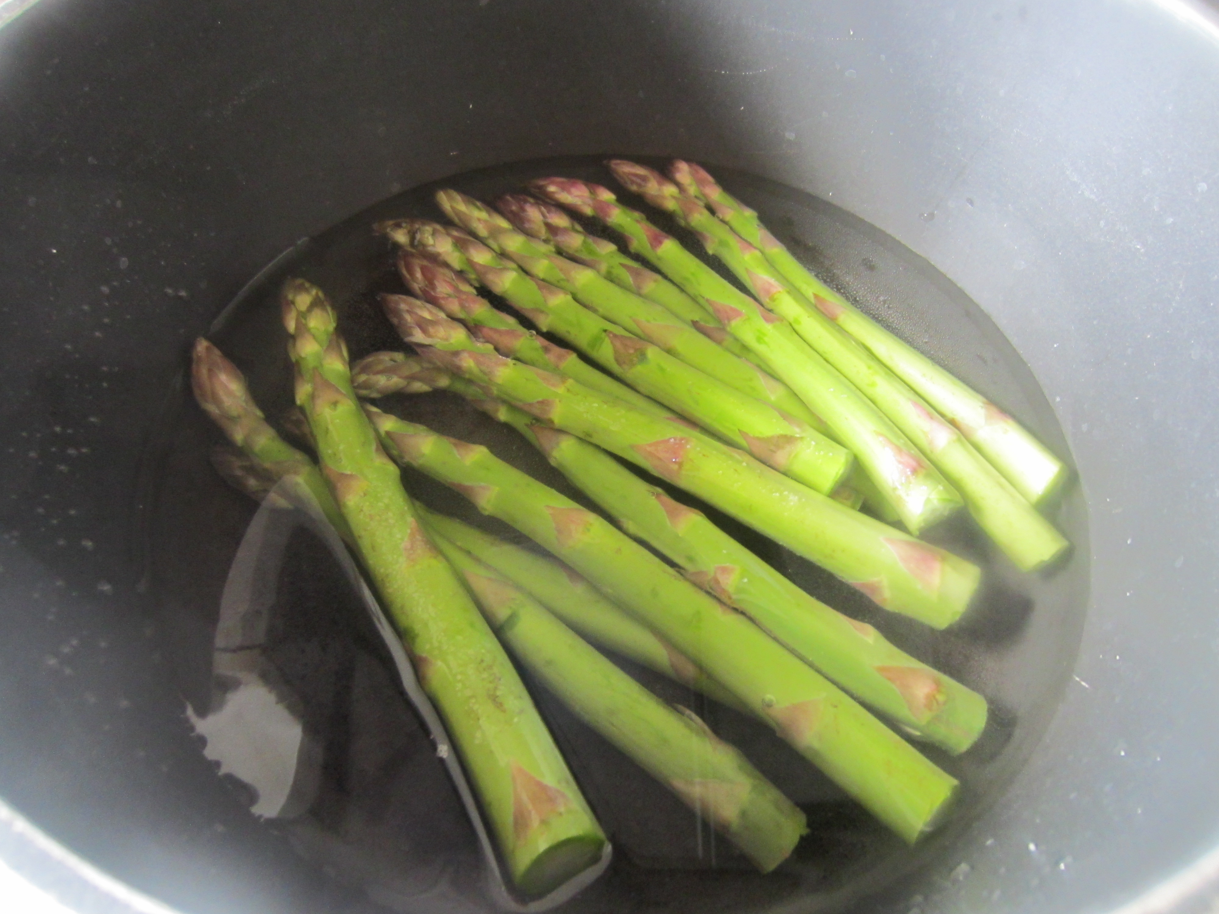 First blanch the asparagus in a little water for 6/8 minutes.