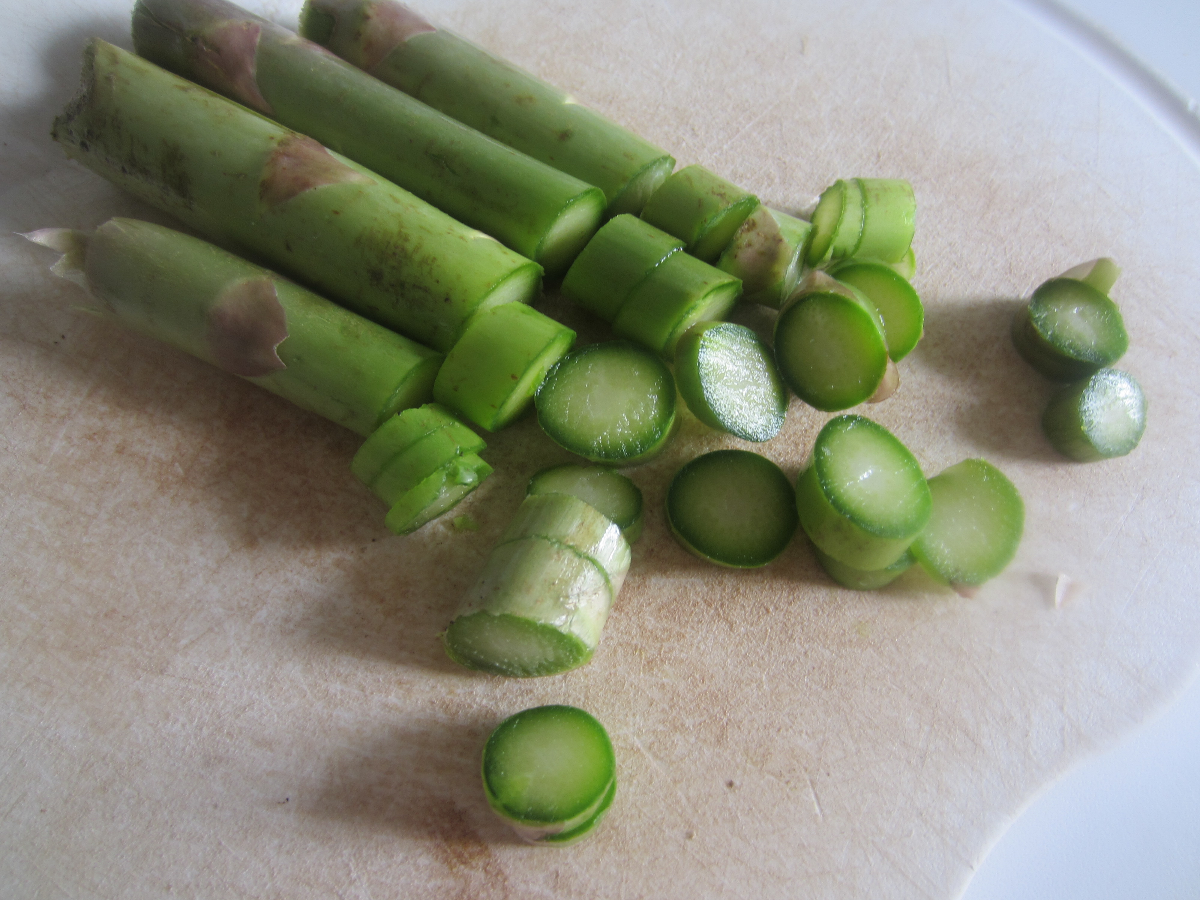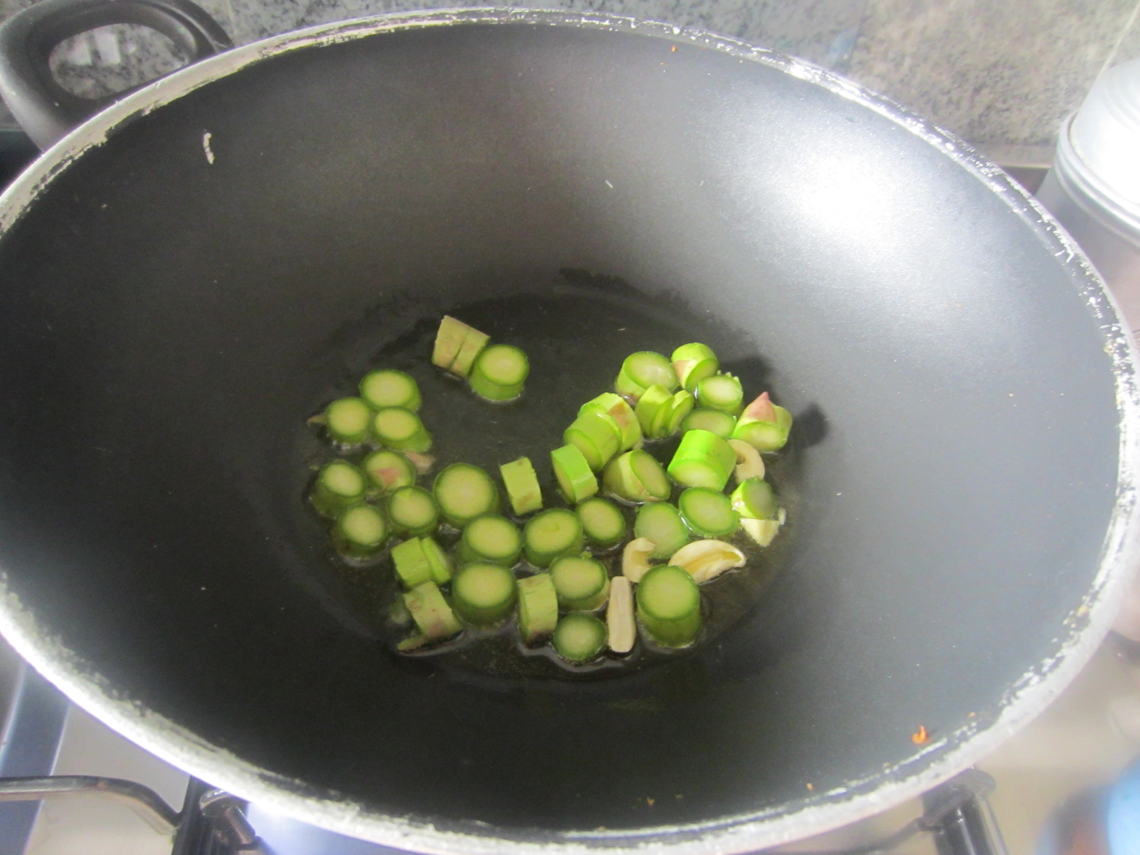 Slice the final part of the asparagus. Slice also the garlic.