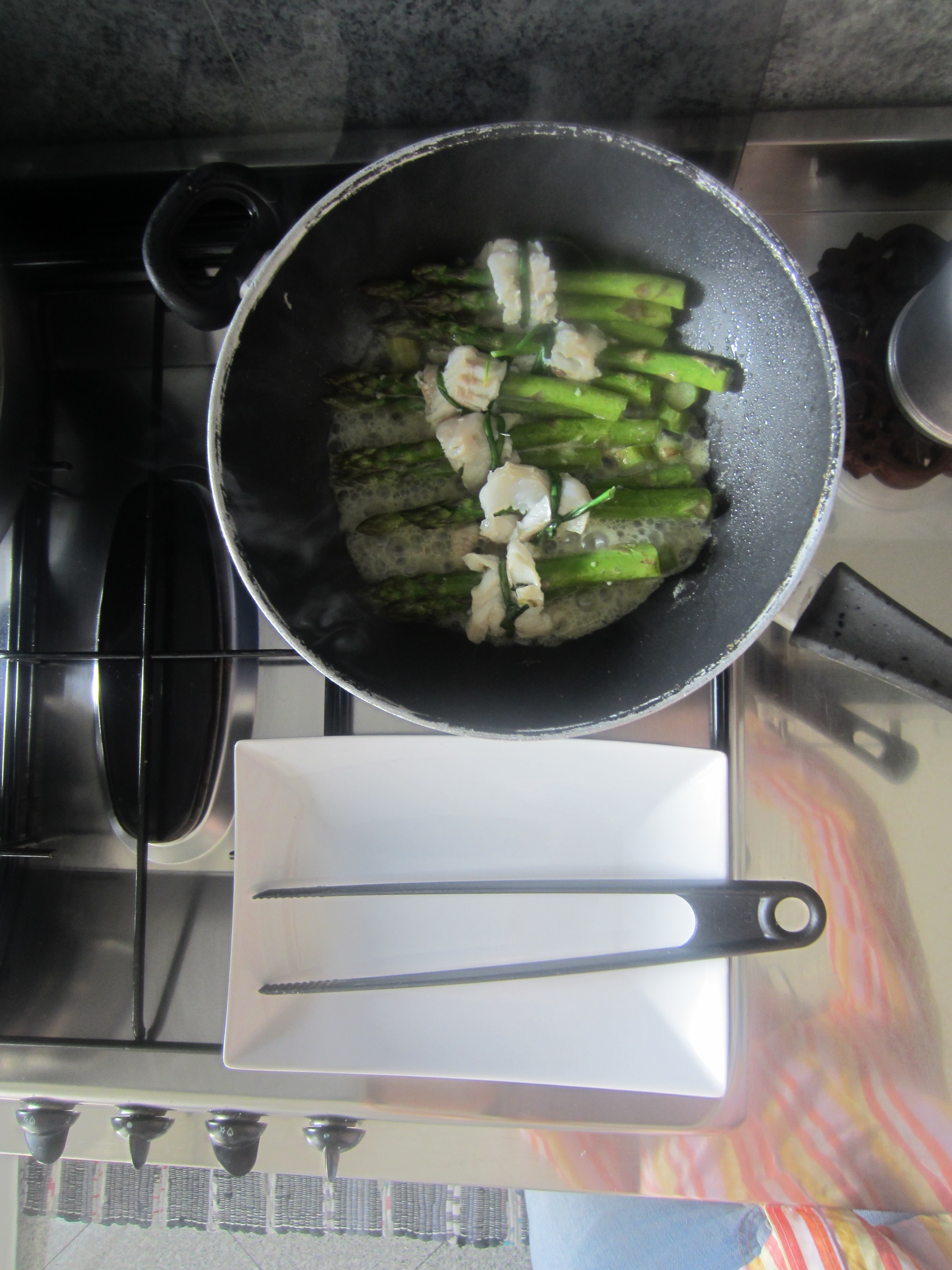 6 cod fillets, skinless, 18 fresh asparagus, some chives, 4 tablespoons olive oil, 1 cup dry white wine, garlic, salt to taste, pepper.