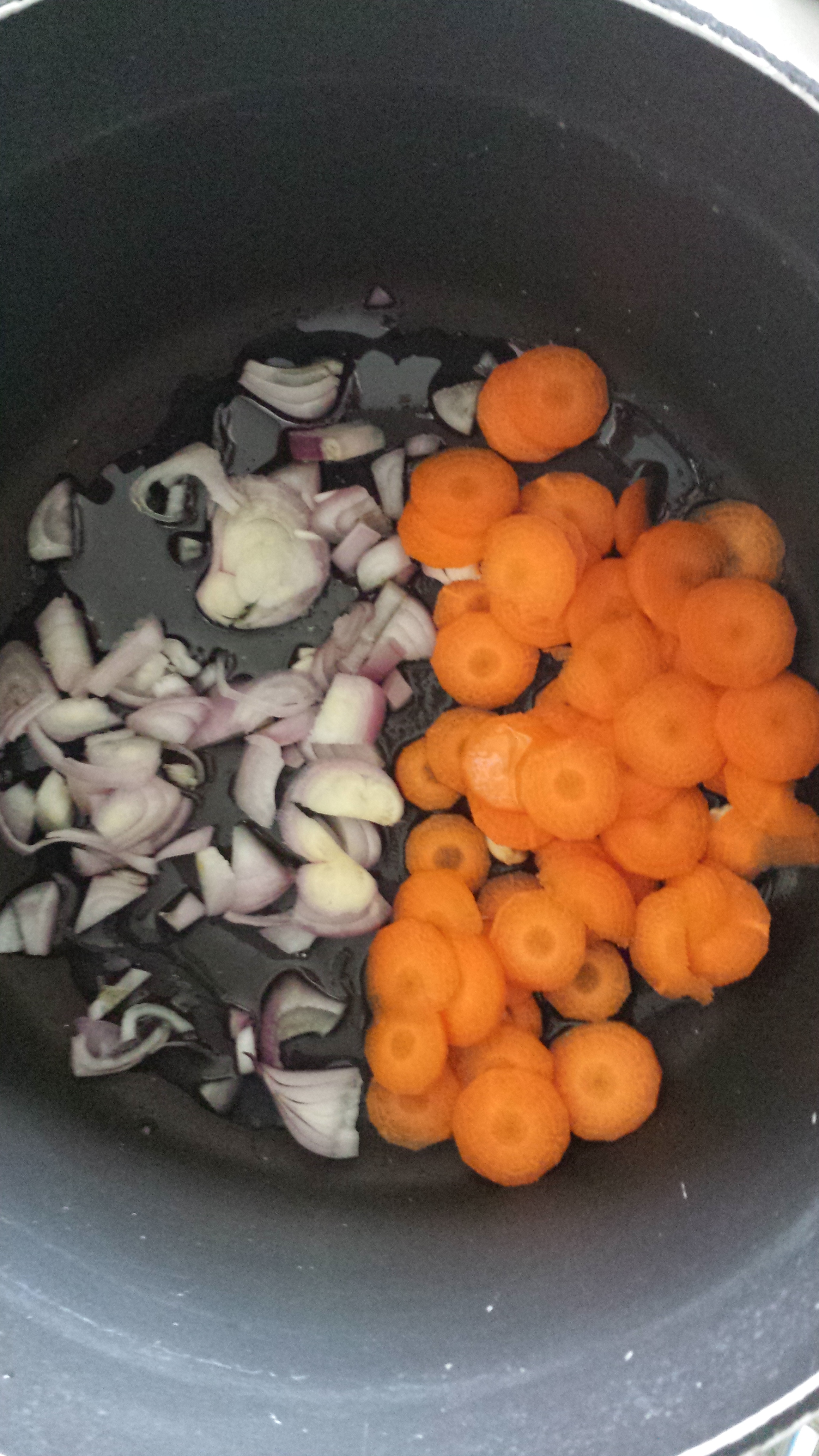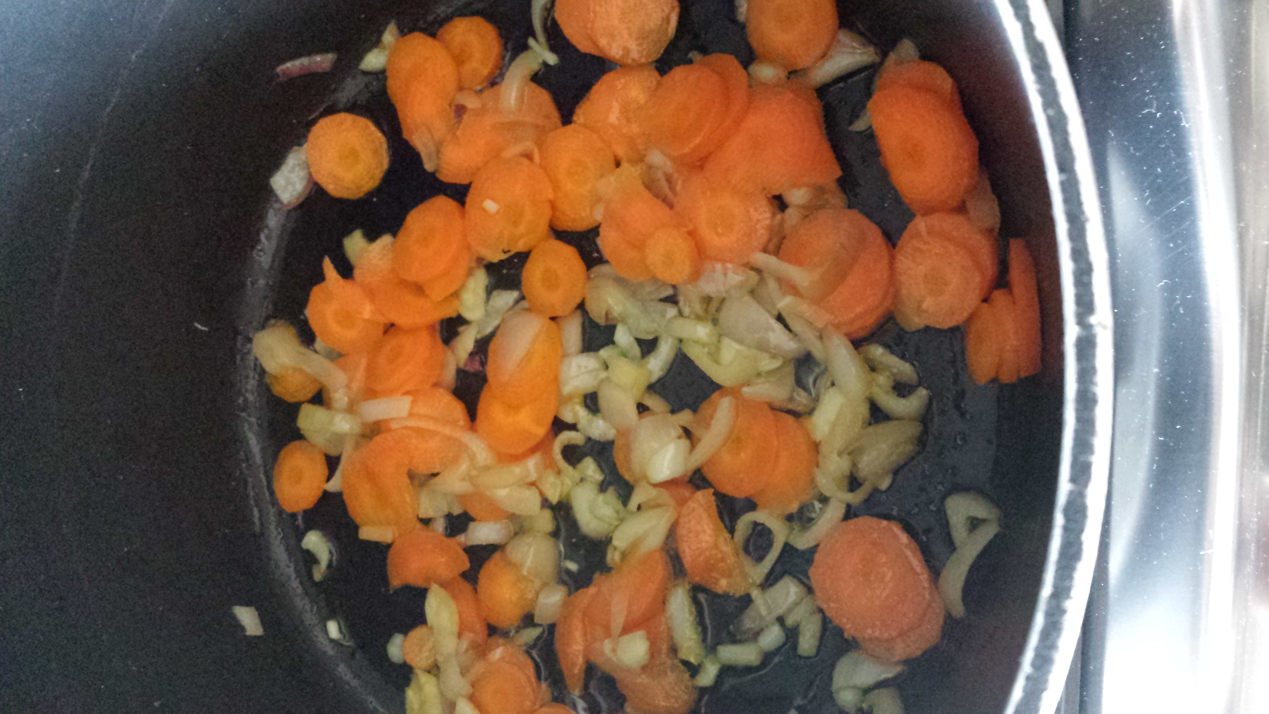 Put in a nonstick pot (which has the cover) 4 tablespoons of olive oil and saute the chopped vegetables.