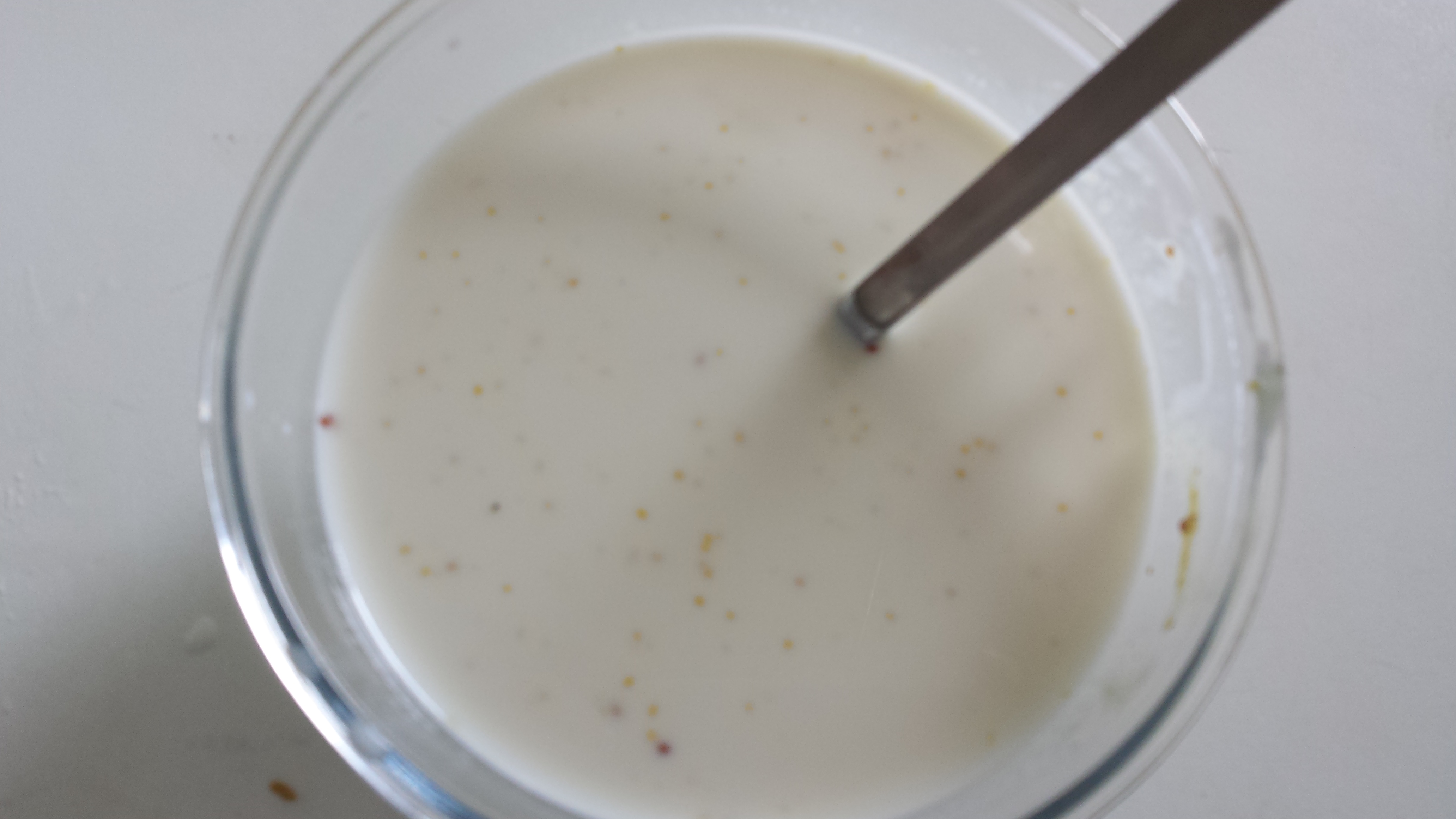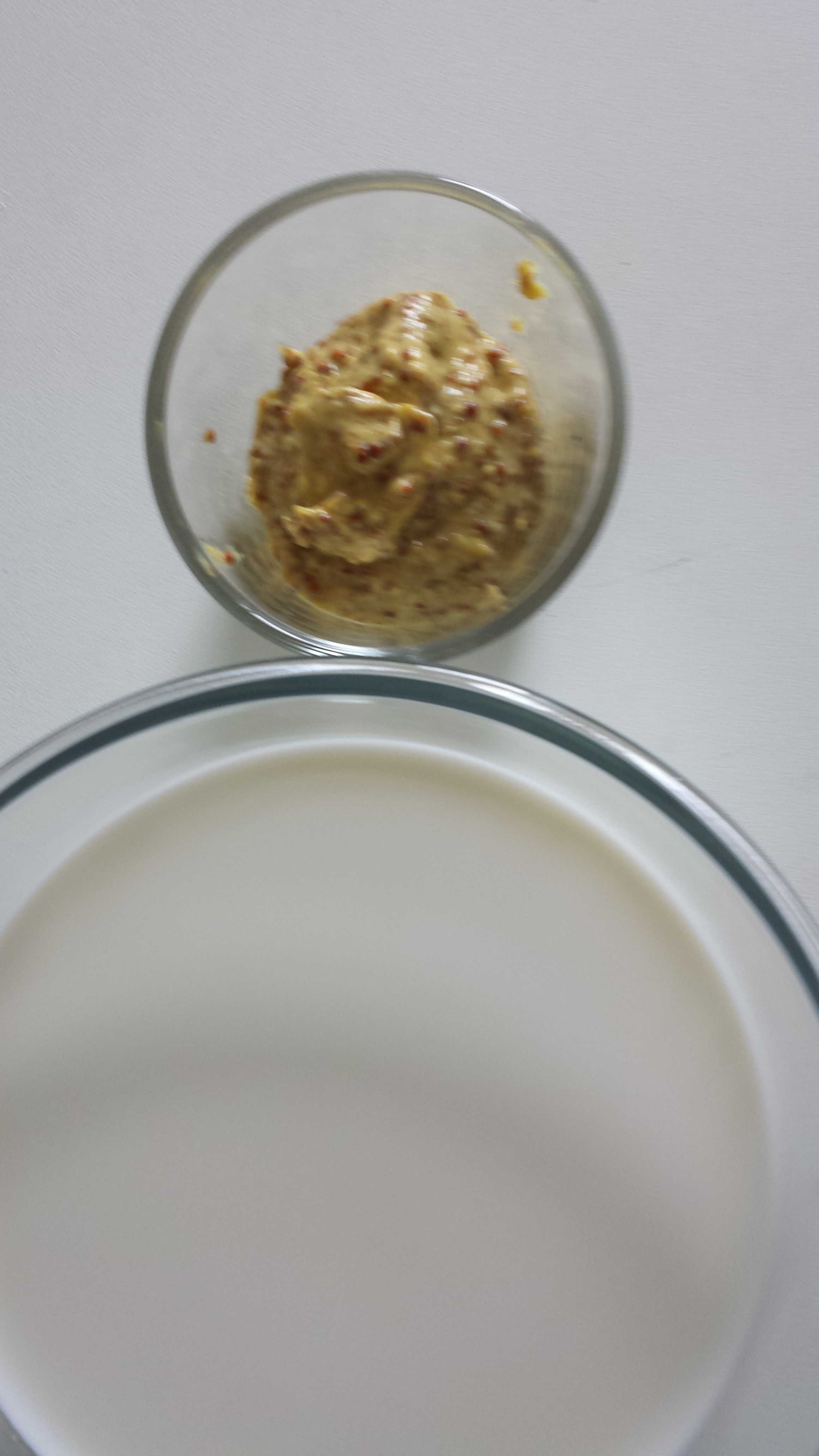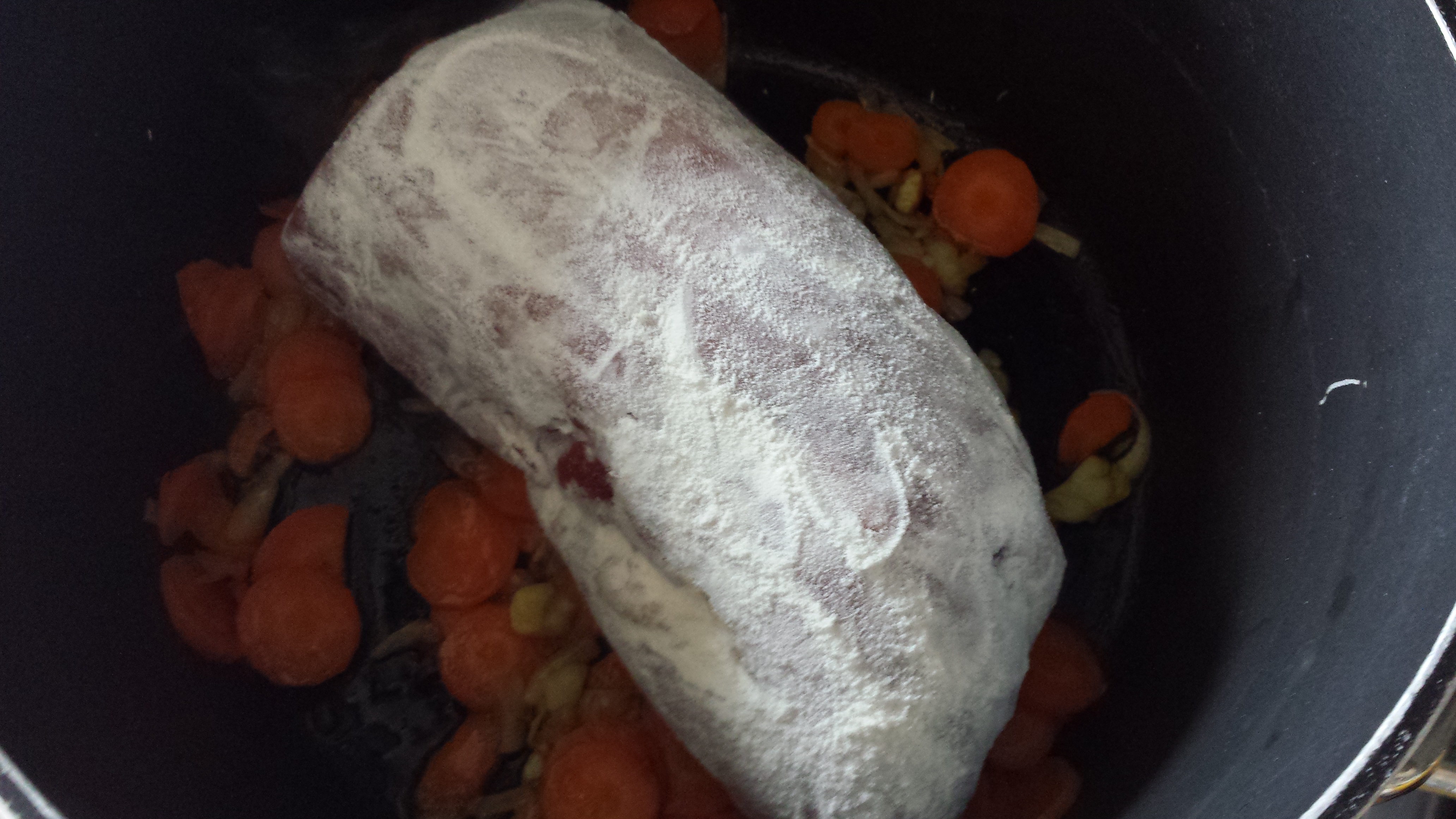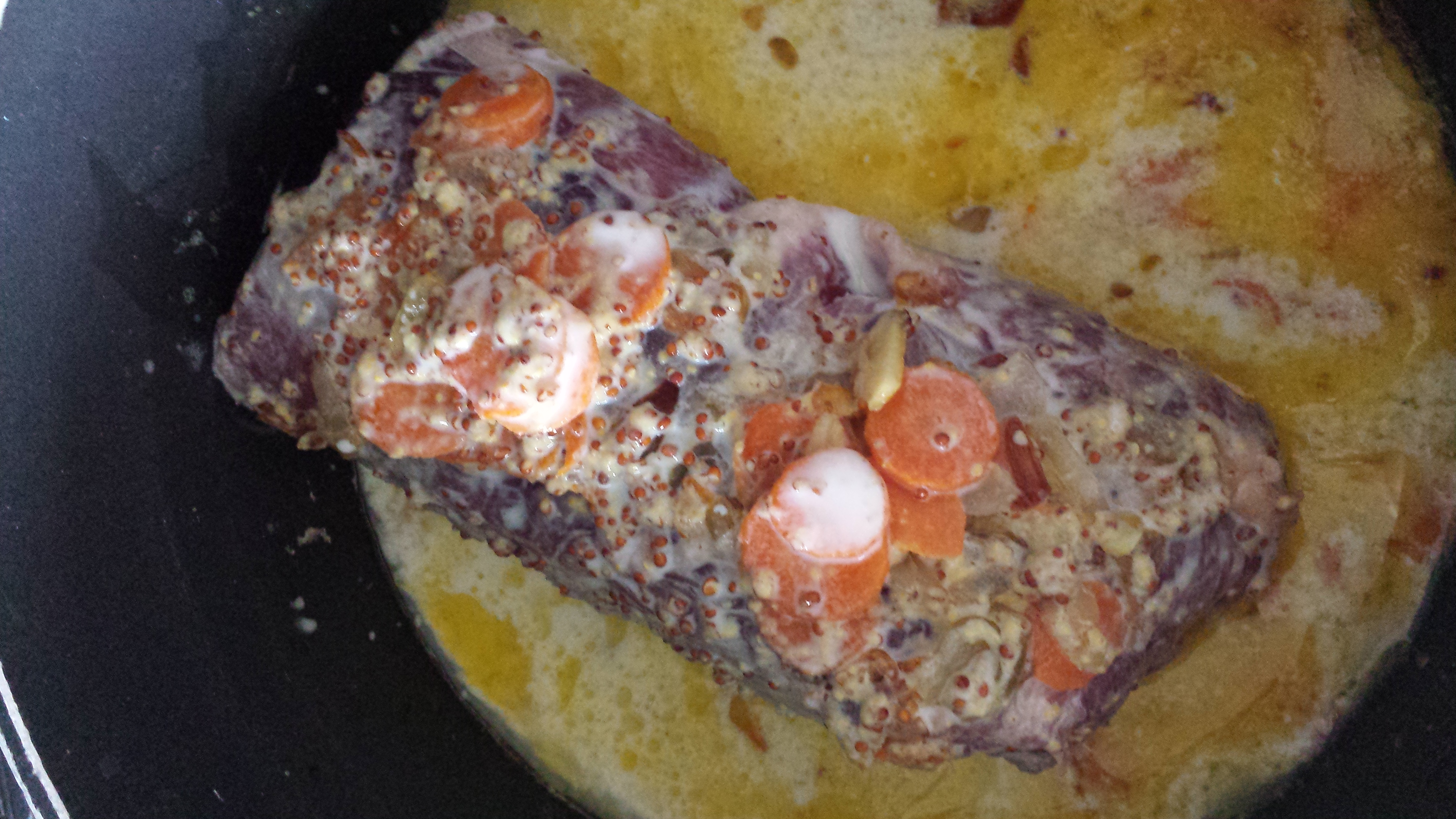 When the meat is well browned slowly add the milk with the mustard, put the lid on and cook on low heat for at least an hour, turning the meat occasionally.