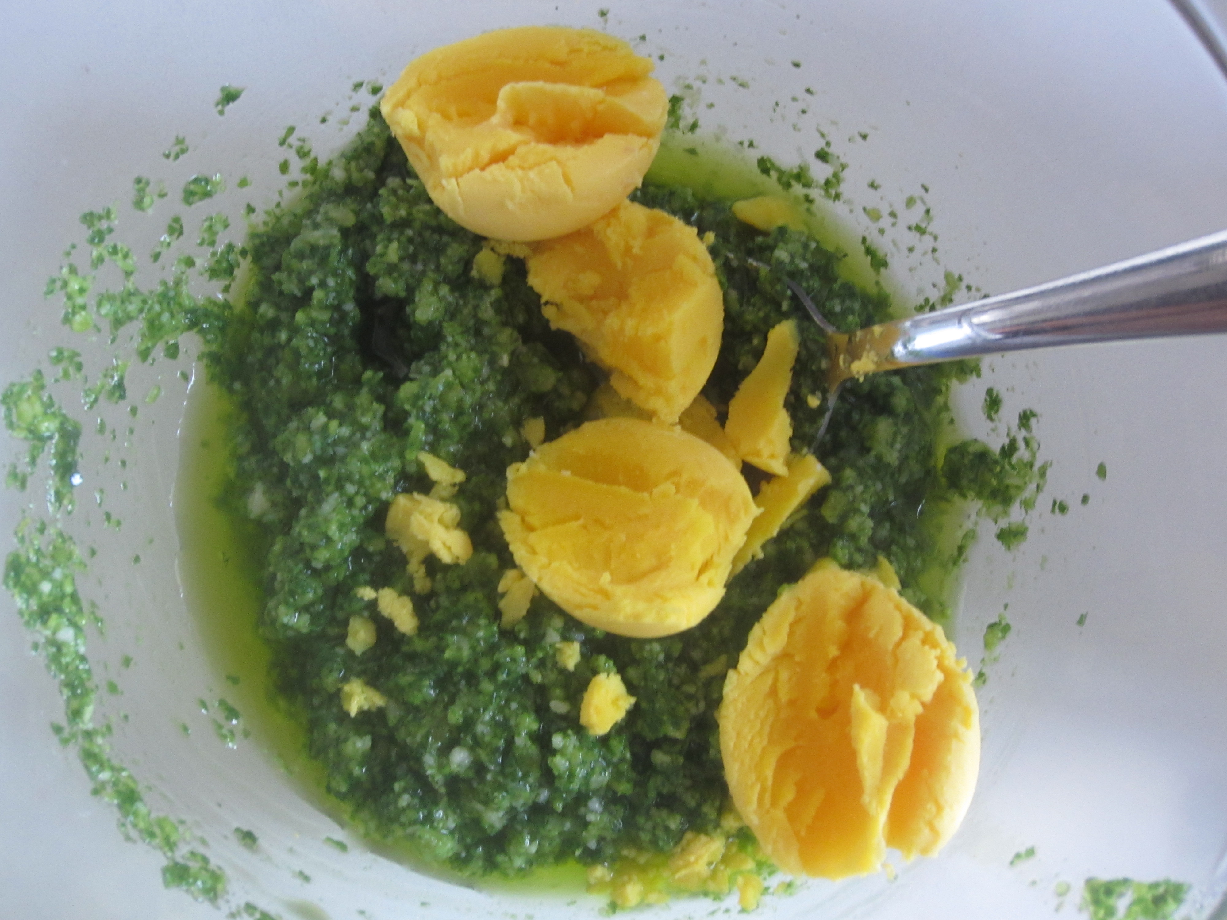 Also add the yolk of the hard-boiled eggs and mix with a fork.