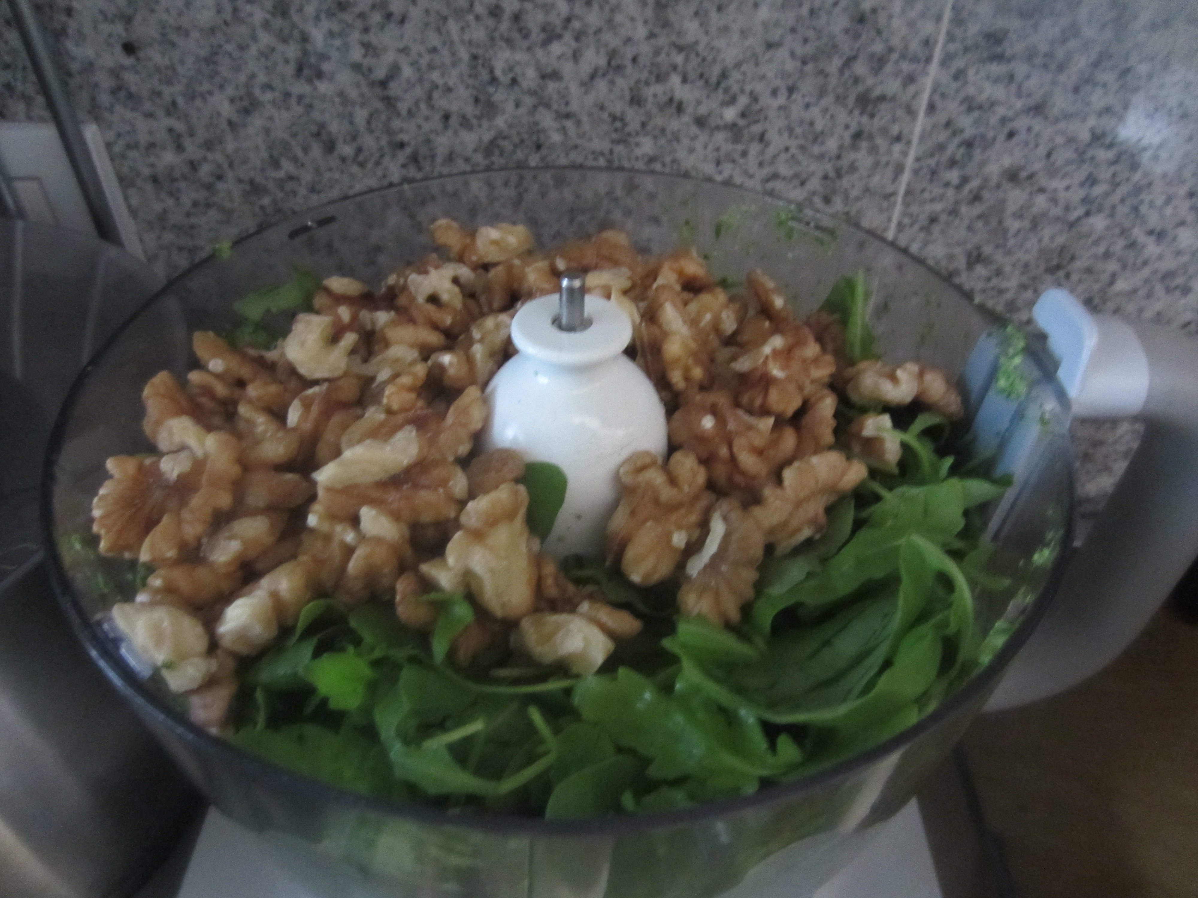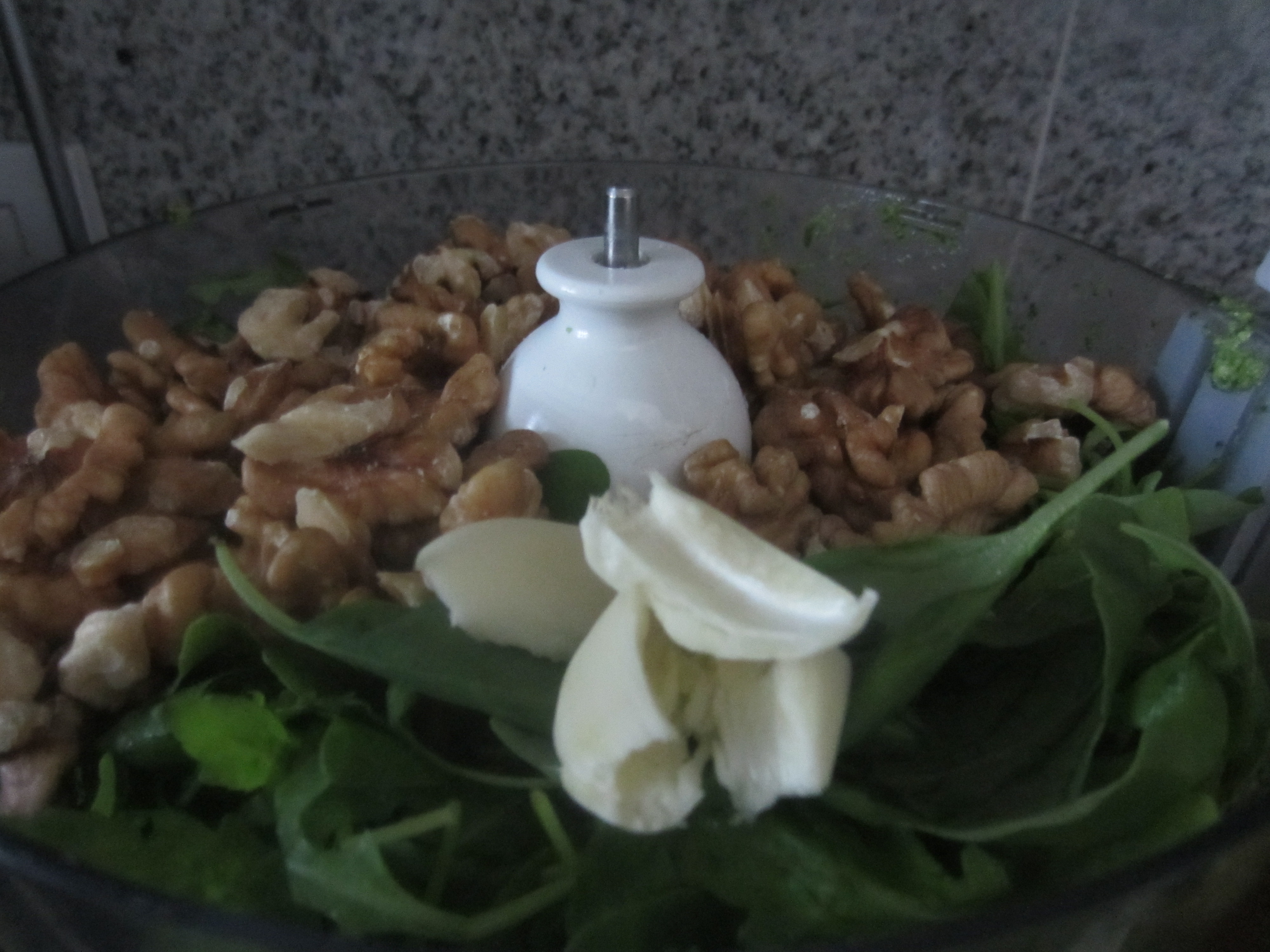 100 grams – 1 cup – arugula leaves, 100 grams of walnuts without shell – ½ cup, 1 cup extra-virgin olive oil, 1 or 2 cloves of garlic, depending on your taste (you can not put it at all), 100 grams of grated Parmesan cheese and finally half a cup of hot water from the pasta.